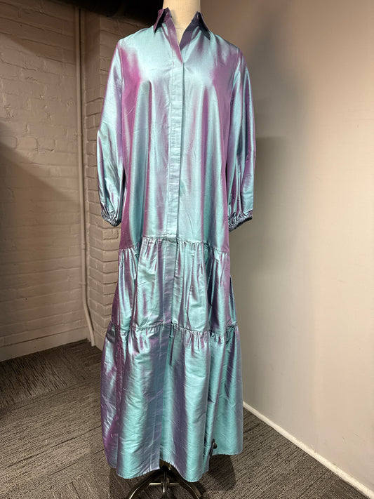 Women Size S Ann Mashburn Blue Iridescent Silk Shantung Drop Waist Dress