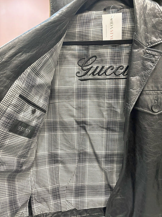 Gucci Black Leather Solid Men's 48 Button Down Plaid Lining Jacket