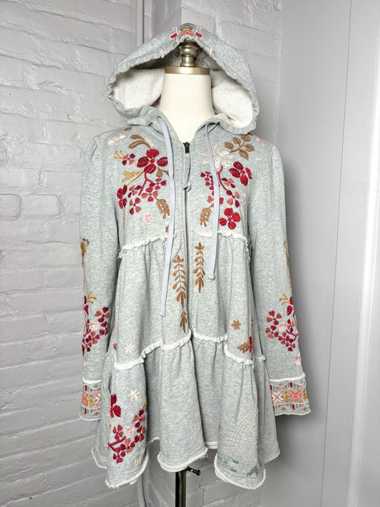 Women Size S Johnny Was Gray Embroidered Cotton Zip Front Hood Jacket
