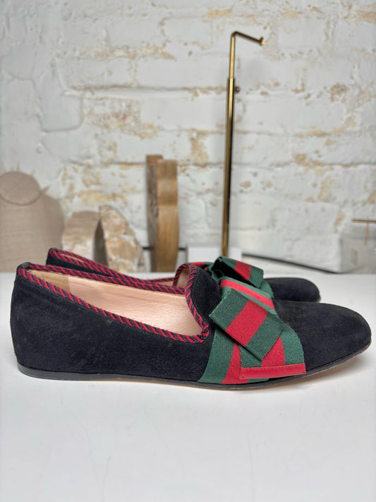 W Shoe Size 37 (6.5) Gucci Black Suede Red, Green Bow Loafers
