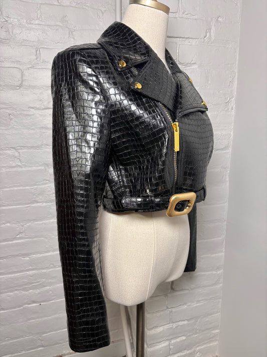 Women Size M Alice + Olivia Black Croc Embossed Faux Leather Moto Jacket