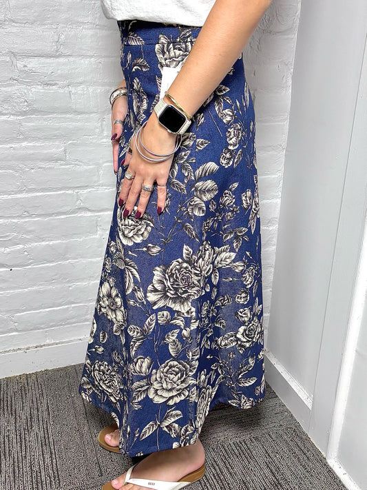 Women Size M Oscar de la Renta Blue Rose Print Pre-owned Midi Denim Skirt
