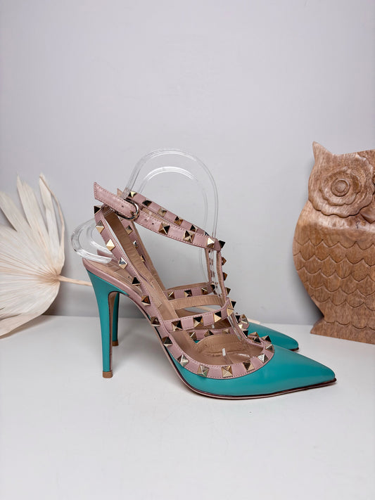 W Shoe Size 7 Valentino Garavani Turquoise Leather Rockstud Heels