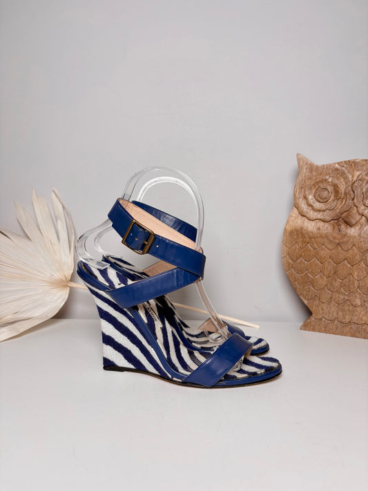W Shoe Size 37 (7) Manolo Blahnik Blue, White Zebra Print Canvas Wedge