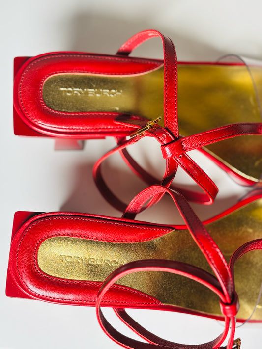 W Shoe Size 9 Tory Burch Red Leather, PVC Cowhide T-Heels Sandals