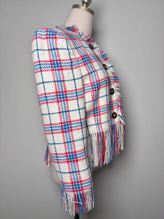Women Size 10 Veronica Beard Cream, Blue, Red Checkered, Fringed Blazer