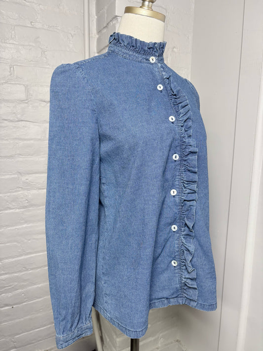 Women Size 34 (2) A.P.C Rue Madame Blue Pinstripe Cotton Ruffle Trim Shirt