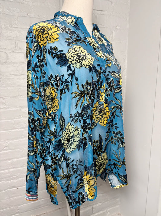 Women Size 2 Johnny Was Teal Floral Print Rayon, Silk NWT Shirt