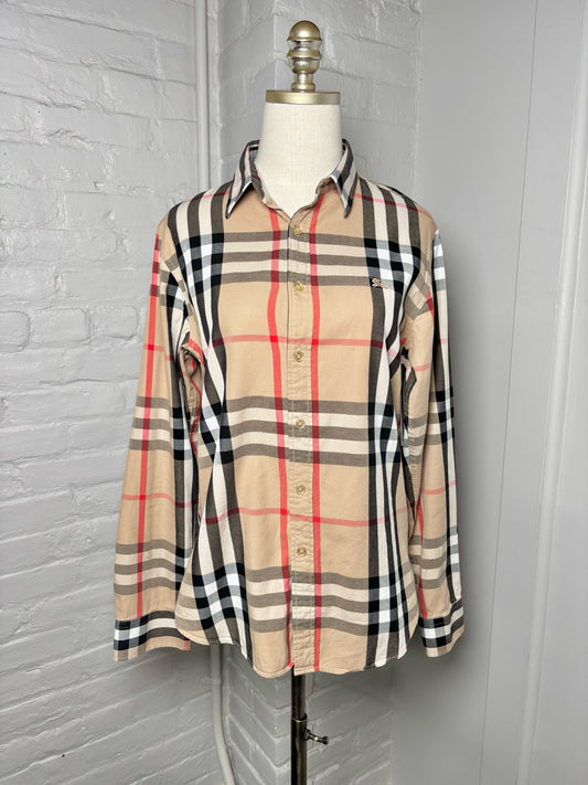 Women Size XL (Fits S) Burberry Khaki, Black, Red, White Check Print Shirt