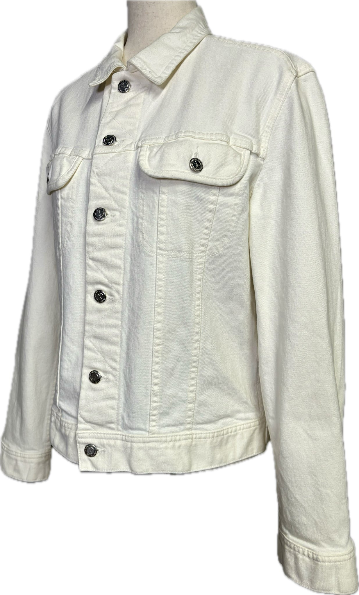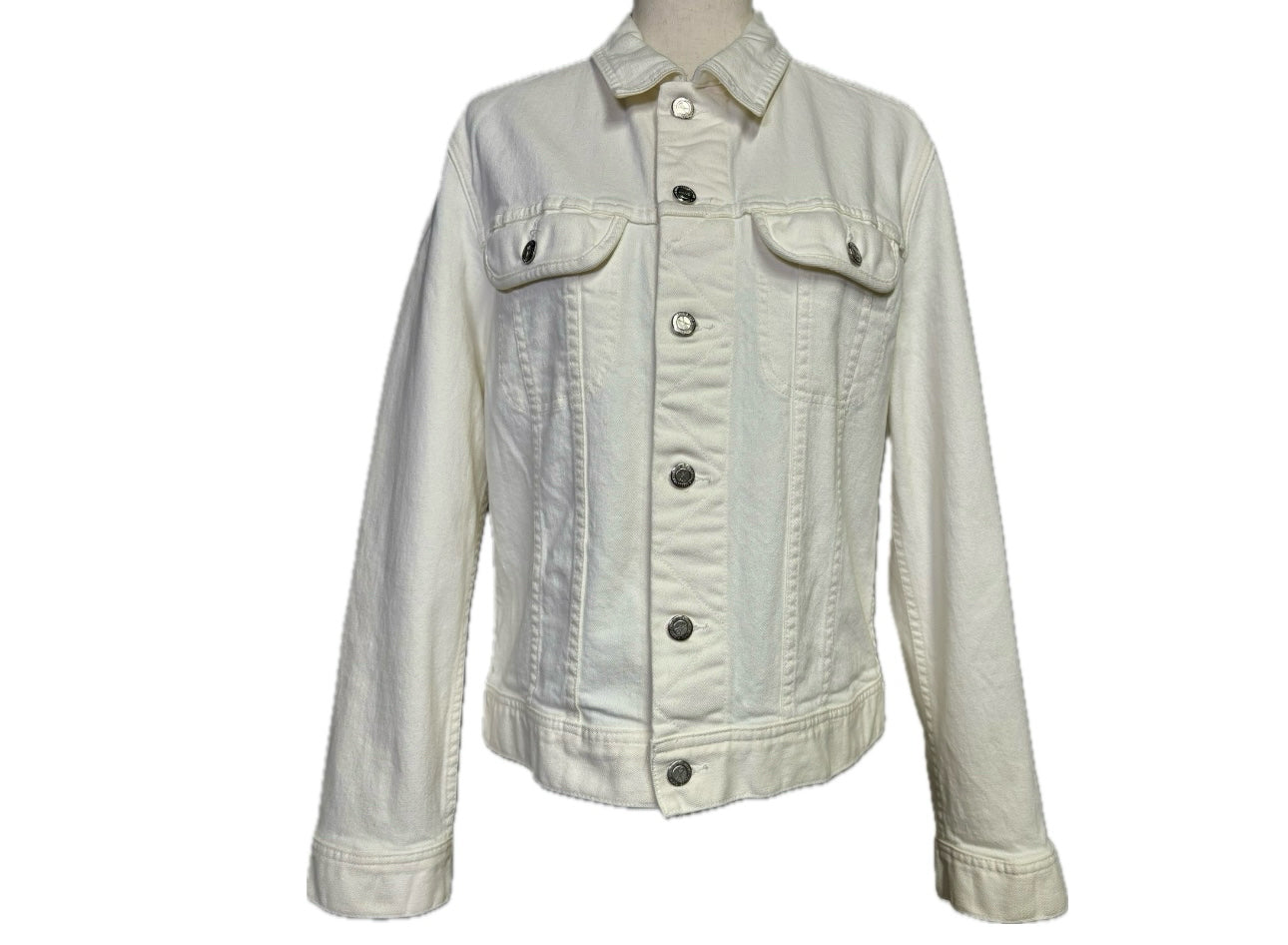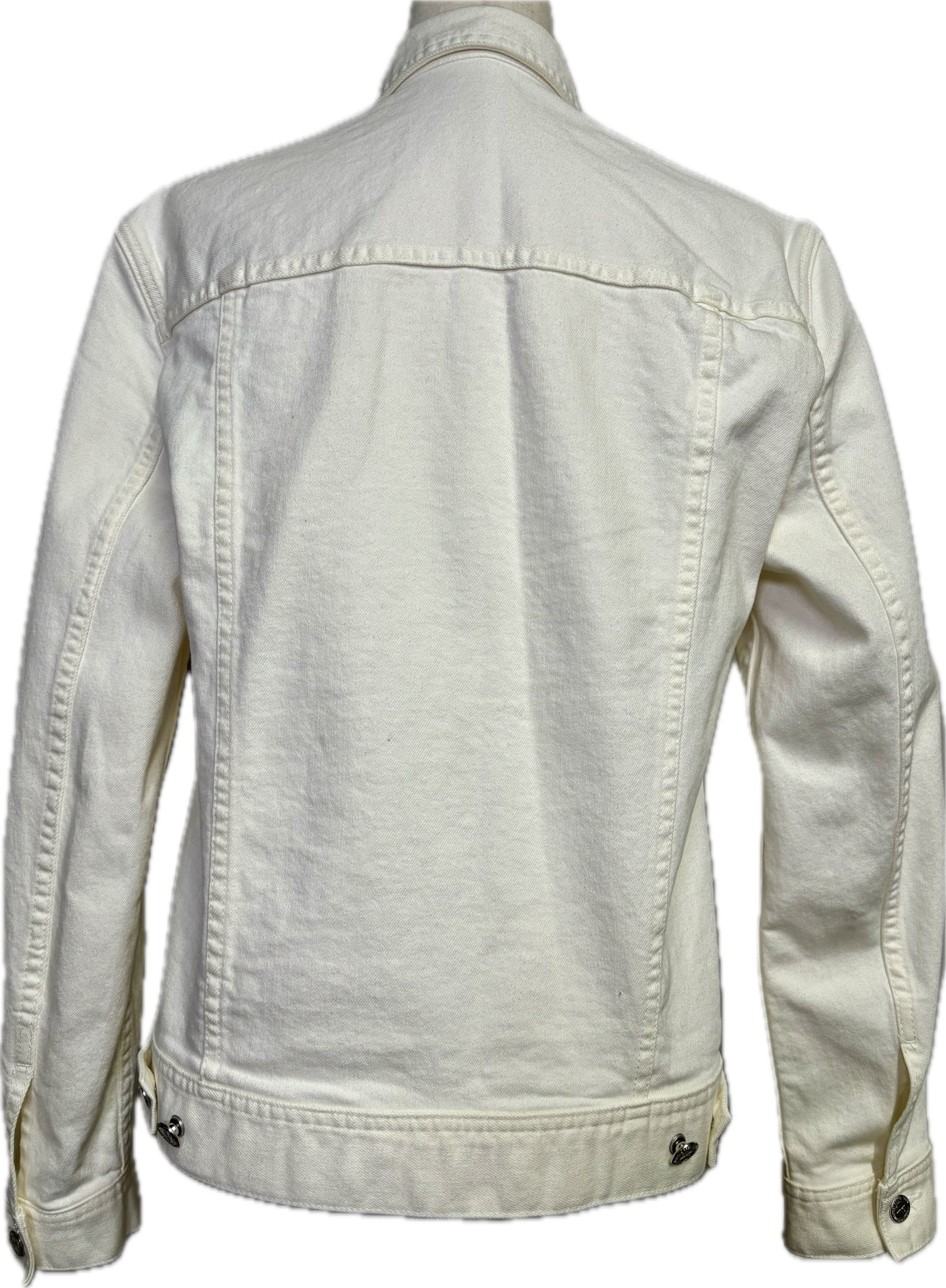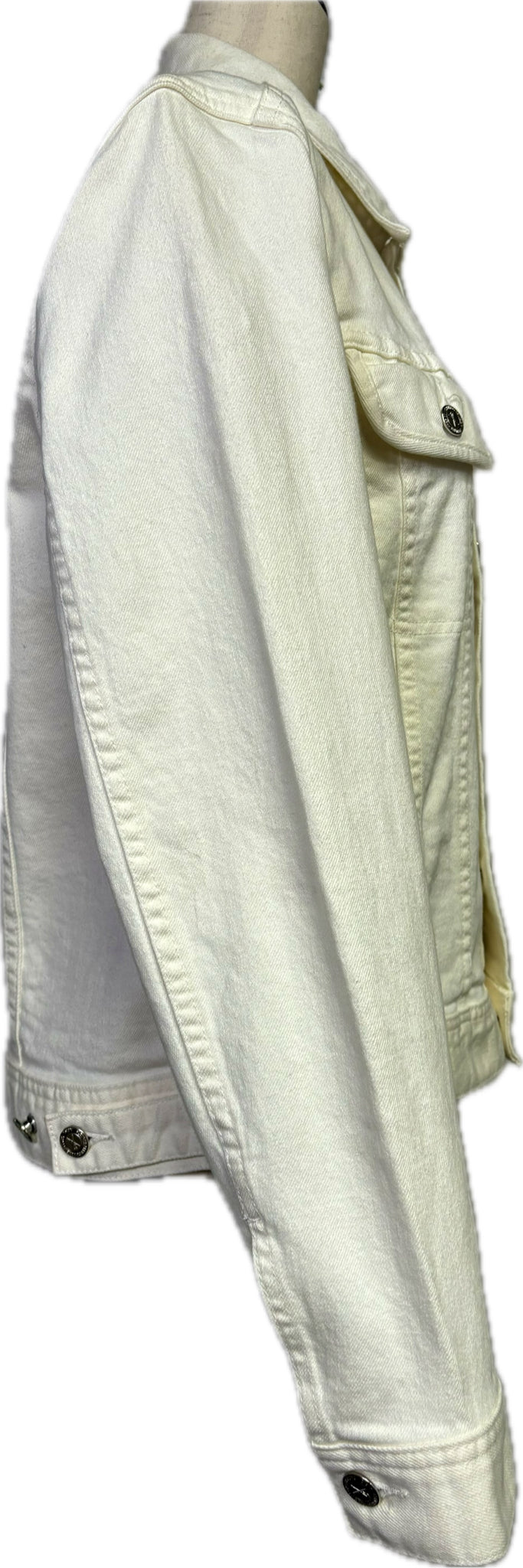 Men's collard ivory jean jacket with silver buttons.