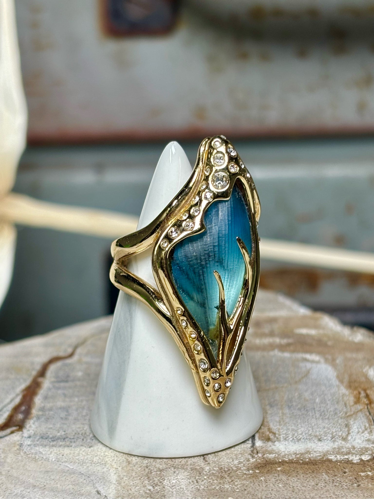 This Alexis Bittar statement ring showcases a stunning turquoise butterfly wing design set in 10k yellow gold, embodying the brand’s signature fusion of artistry and bold elegance. A sculptural piece that catches the light beautifully, it’s a striking expression of modern luxury and imaginative craftsmanship.