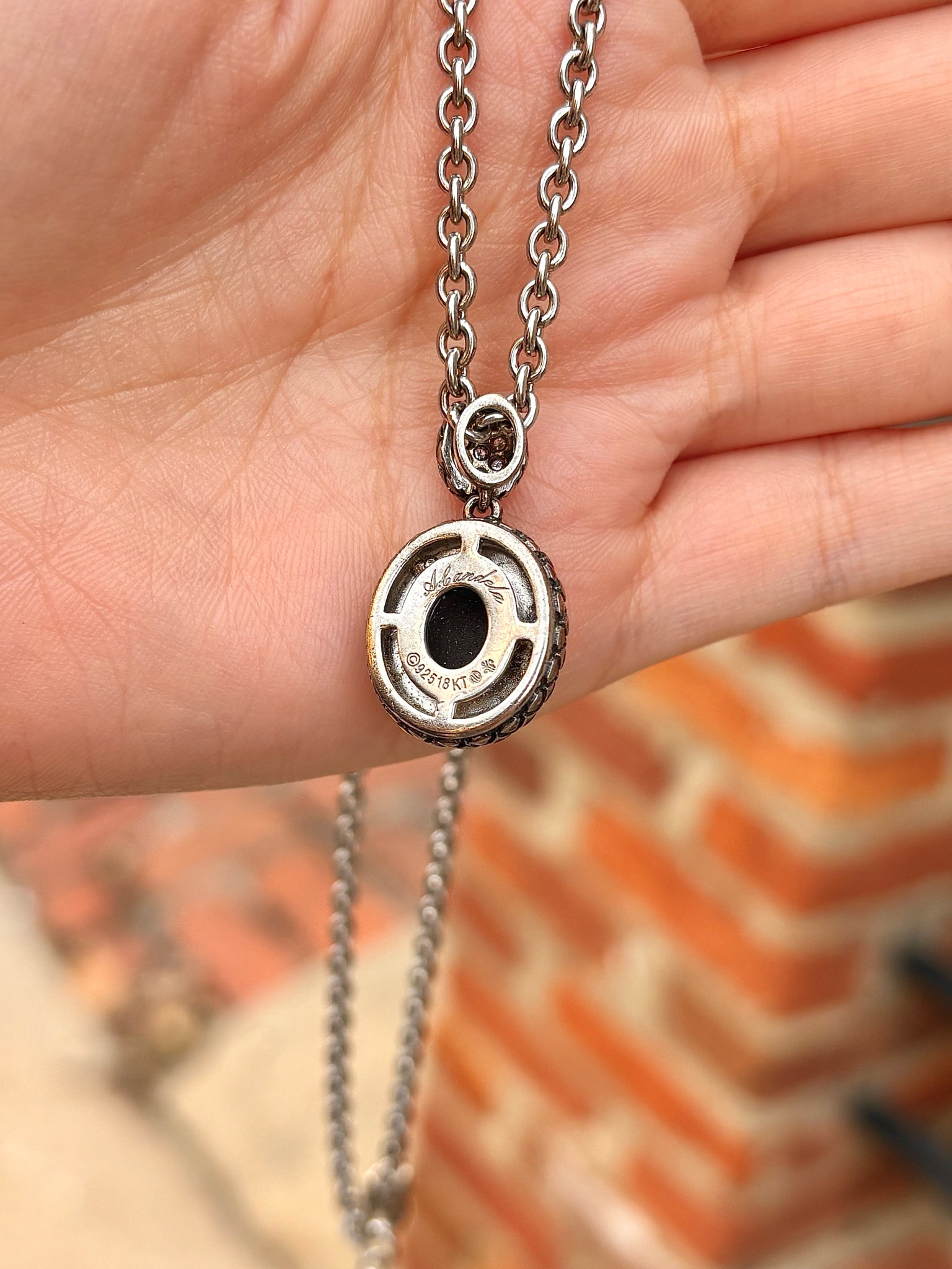 This striking Andrea Candela necklace showcases an oval onyx gemstone framed by pavé diamonds in an elegant sterling silver setting with 18K gold accents. The intricate detailing enhances its timeless sophistication, while a lobster clasp closure ensures secure wear. A refined statement piece that blends classic elegance with modern craftsmanship.