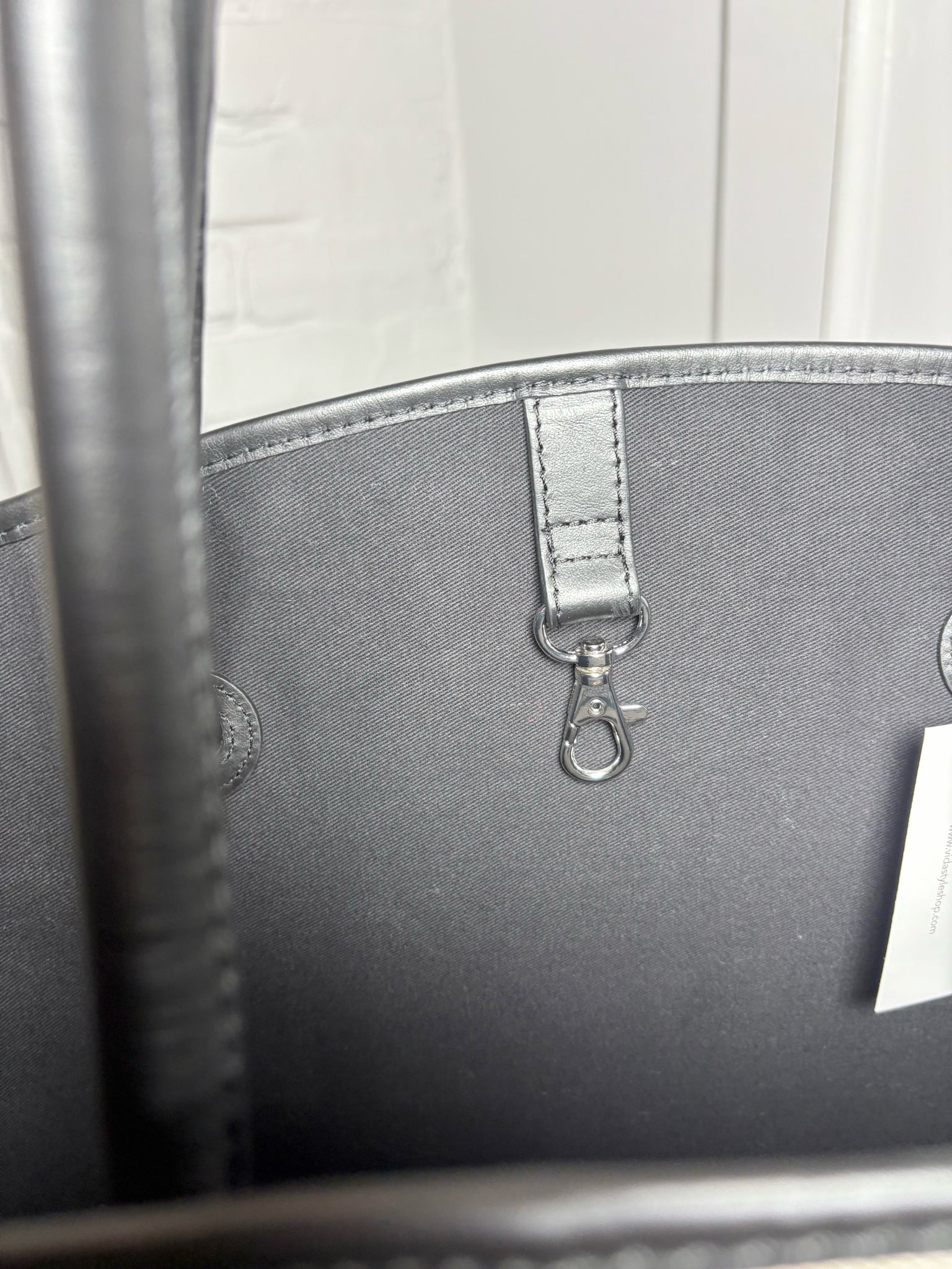 The Anine Bing “Taylin” Tote exudes modern sophistication with its khaki canvas body and sleek black leather trim. Accented with silver-tone hardware, this versatile carryall combines structure and ease—perfect for everyday refinement. Comes complete with its original dust bag.