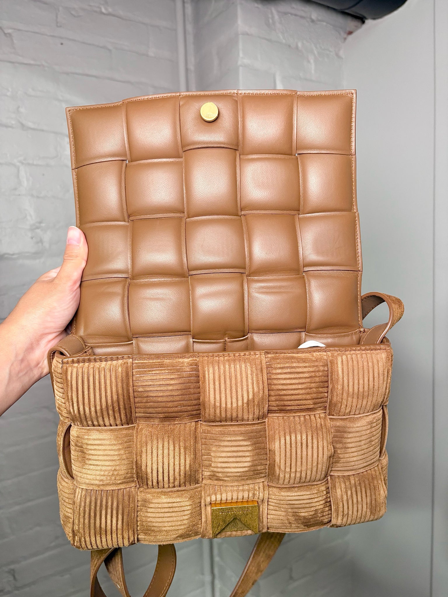 Bottega Veneta Brown Suede Woven Medium Purse — A refined take on the house’s signature Intrecciato design, this padded cassette style is crafted in supple brown suede with an adjustable strap featuring the stamped triangle buckle. Interior details include a zip pocket with protective sticker still intact. Gently used and in like-new condition. Comes with the original dust bag and Entrupy certificate of authenticity!