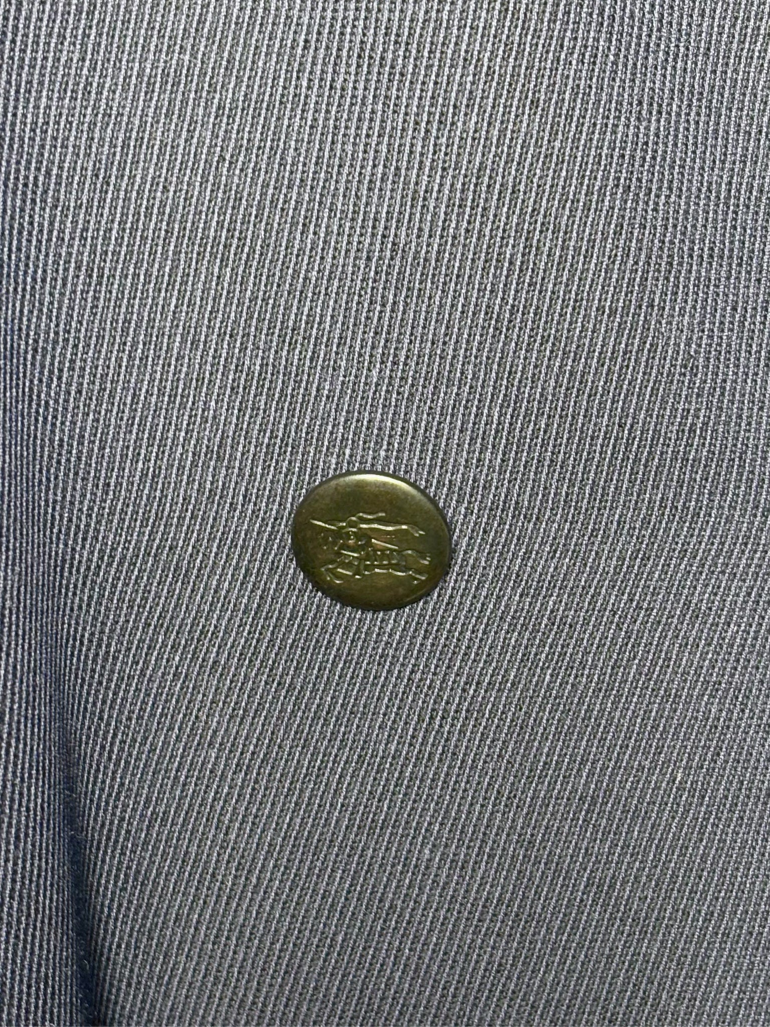 Burberry navy 100% wool long-sleeve trench coat featuring dark gray logo-engraved metal buttons, a sleek black leather buckle belt, and a fully lined interior. Tailored in a size L, this refined silhouette delivers classic Burberry sophistication with a timeless, structured finish.