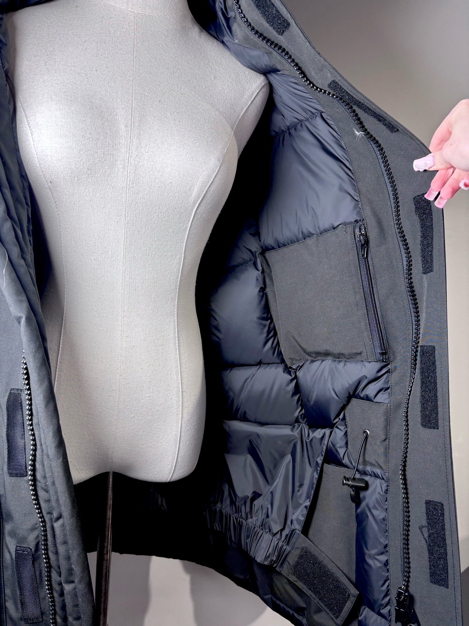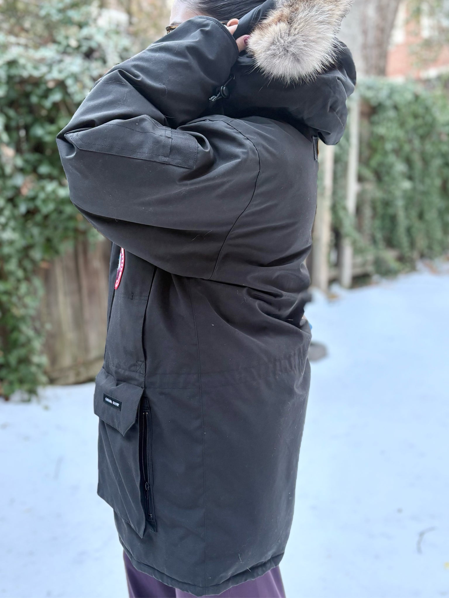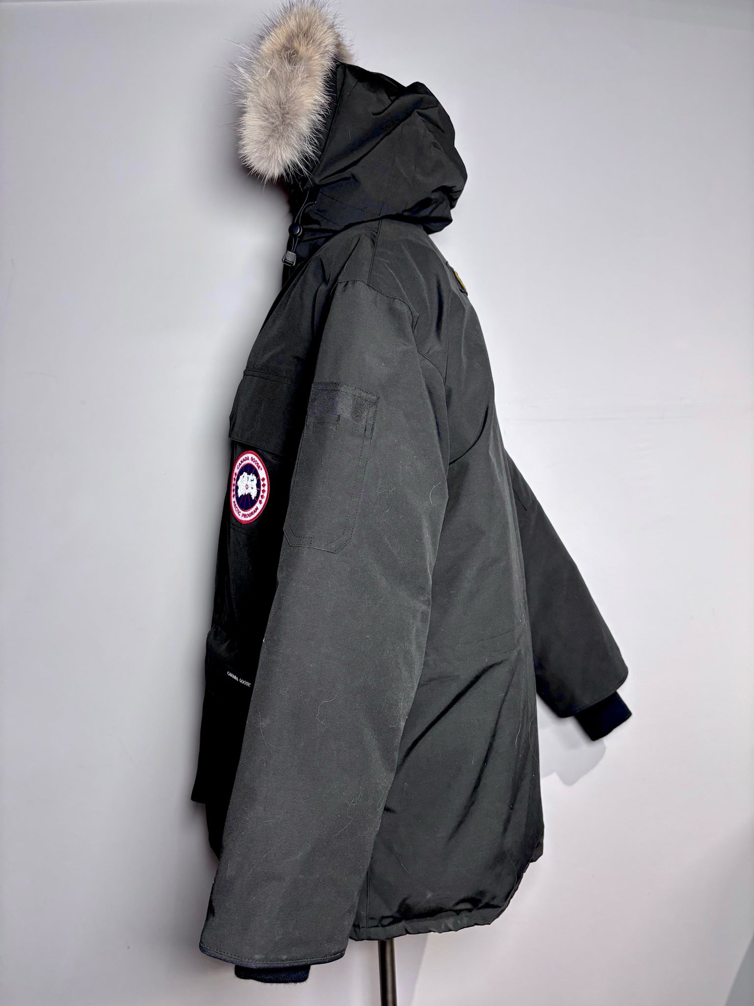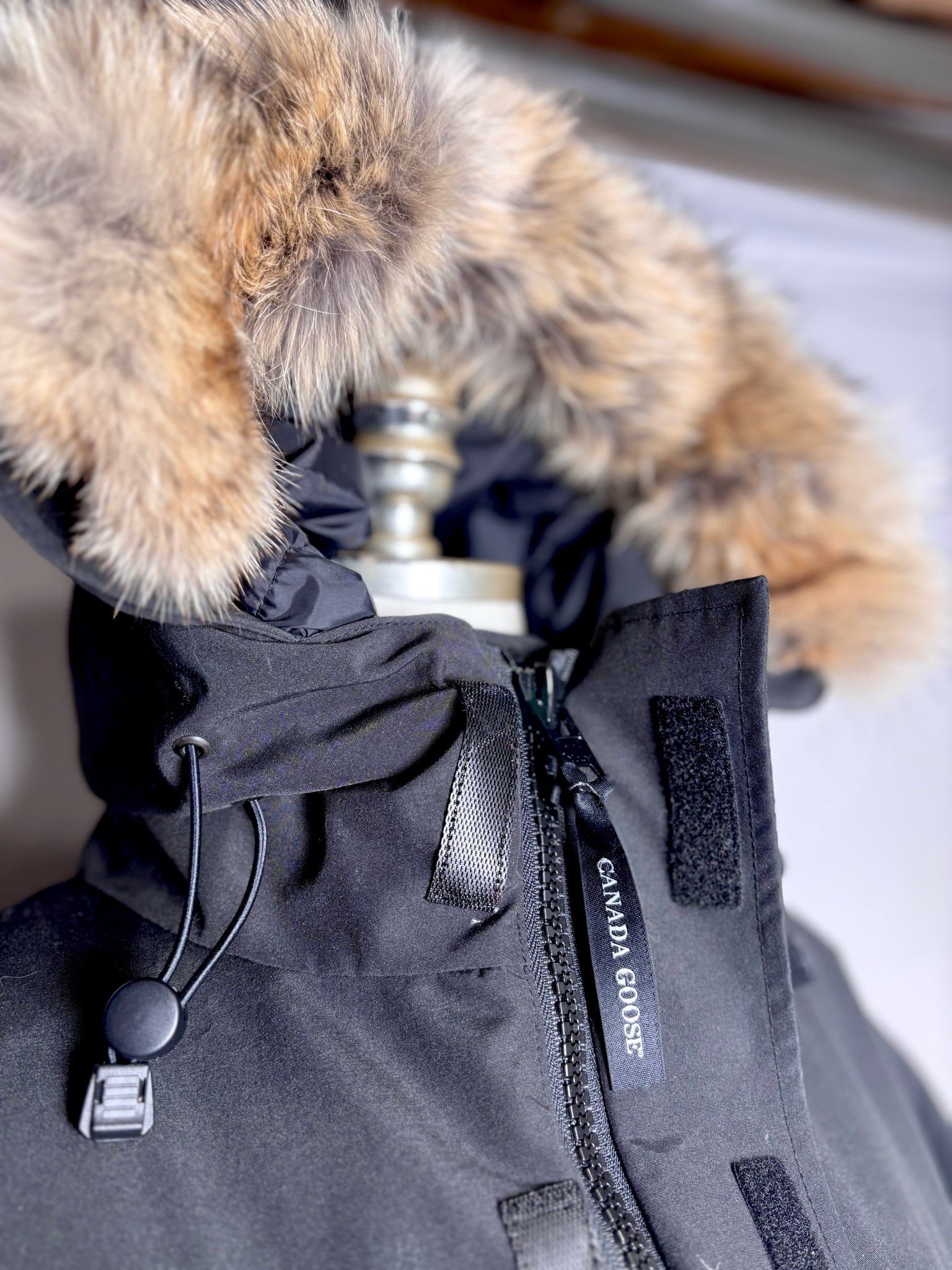 Built for performance with elevated detail, this Canada Goose men’s jacket is crafted in black polyester blend and features a removable coyote fur hood trim with a lined chin guard for added protection. Designed with a placket and velcro closure over a two-way zipper, recessed rib-knit cuffs, and a webbing grab strap at the upper back finished with the signature “Expedition” emblem patch. Thoughtfully equipped with eight exterior pockets, it is offered in men’s size M.