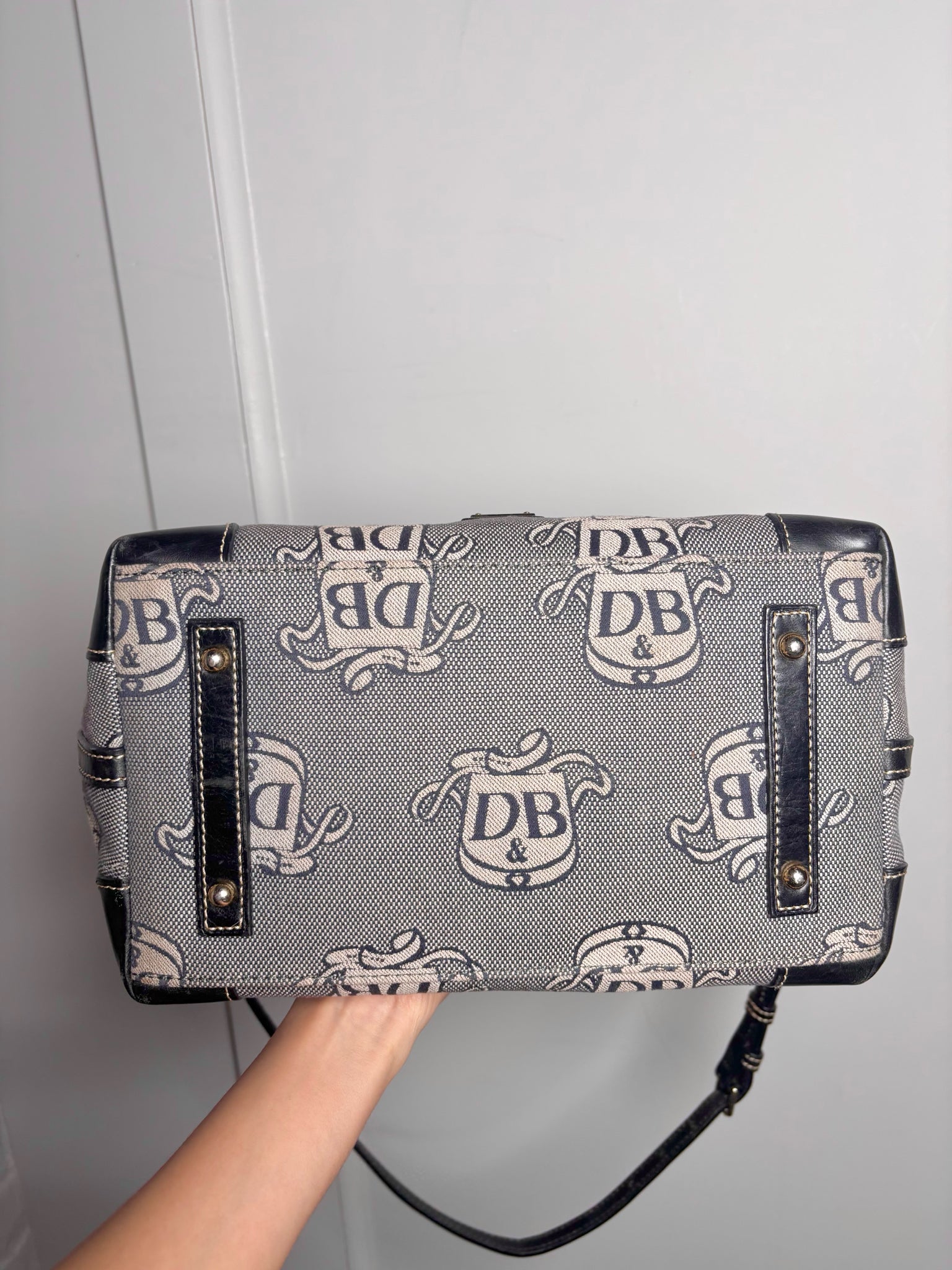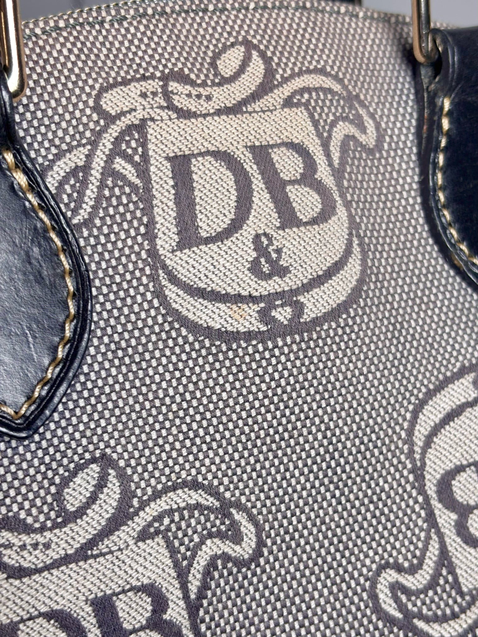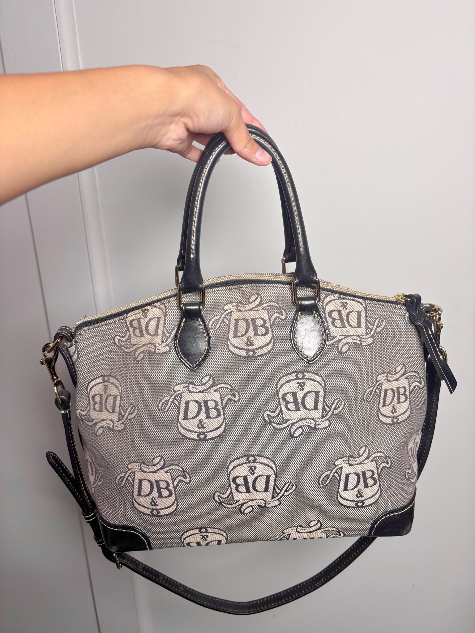 Dooney & Bourke Black and Gray Monogram Satchel — Crafted with signature coated canvas, leather handles, and reinforced bottom corners, this structured satchel features a vibrant red interior lining. Shows a tiny orange mark on the front, priced as-is.