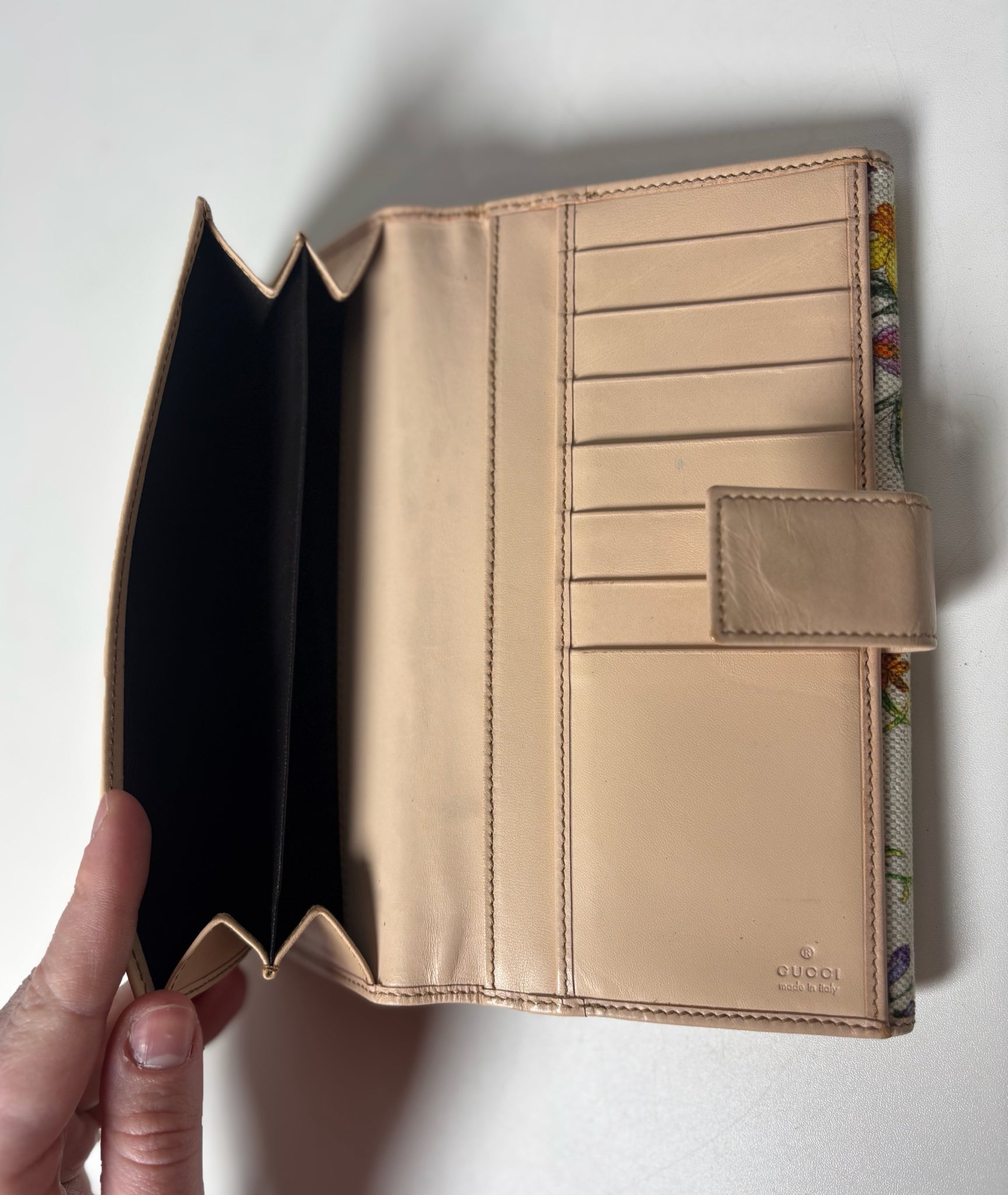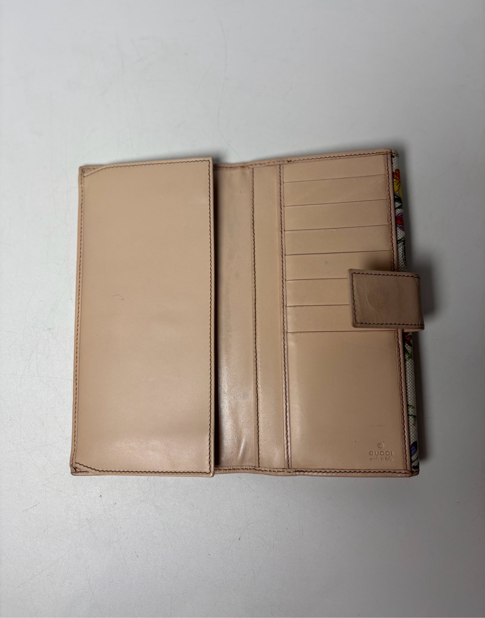 Continental light floral canvas print leather/gold-toned hardware, horsebit detail /snap closure credit card slots/DND/w