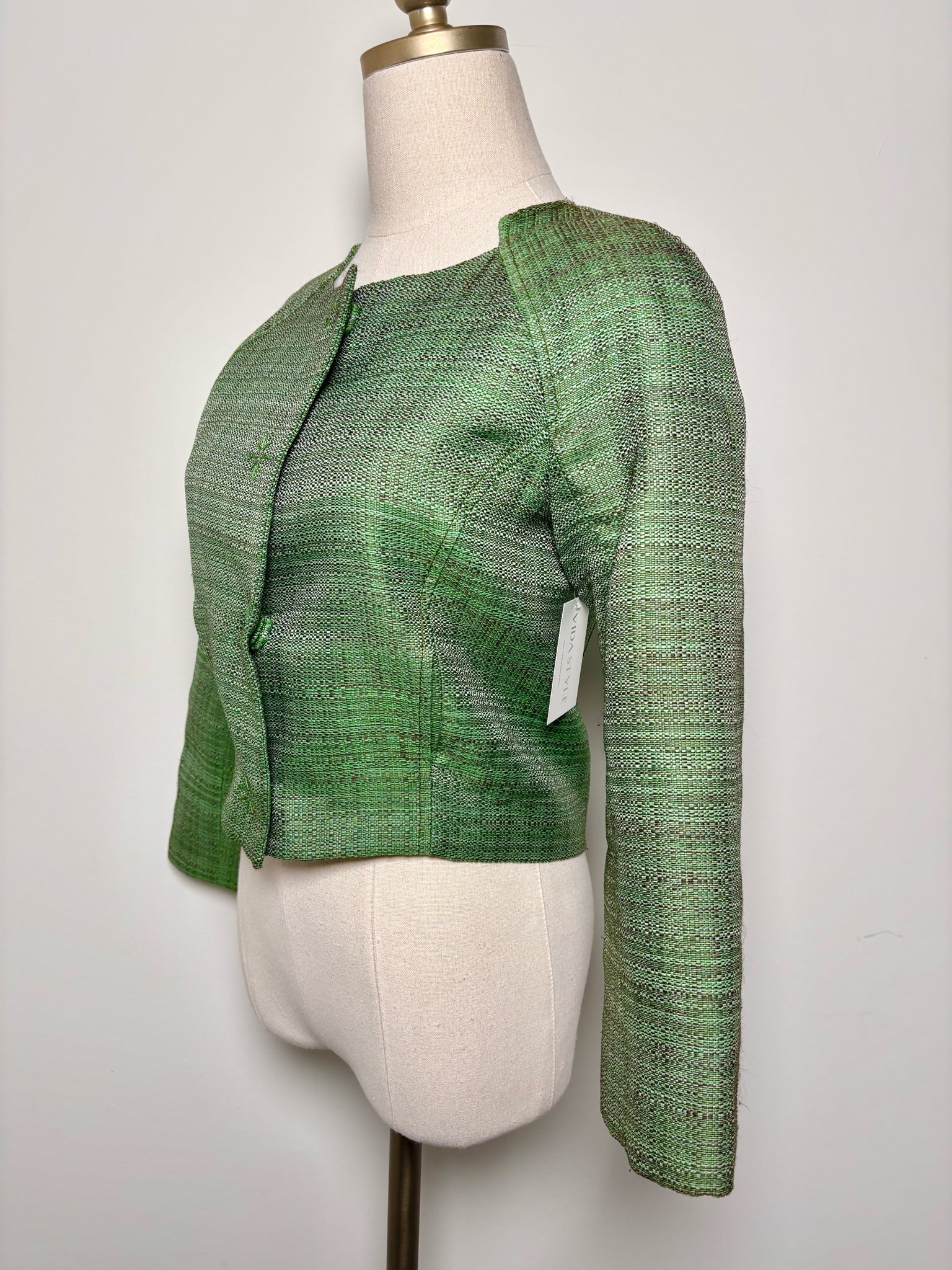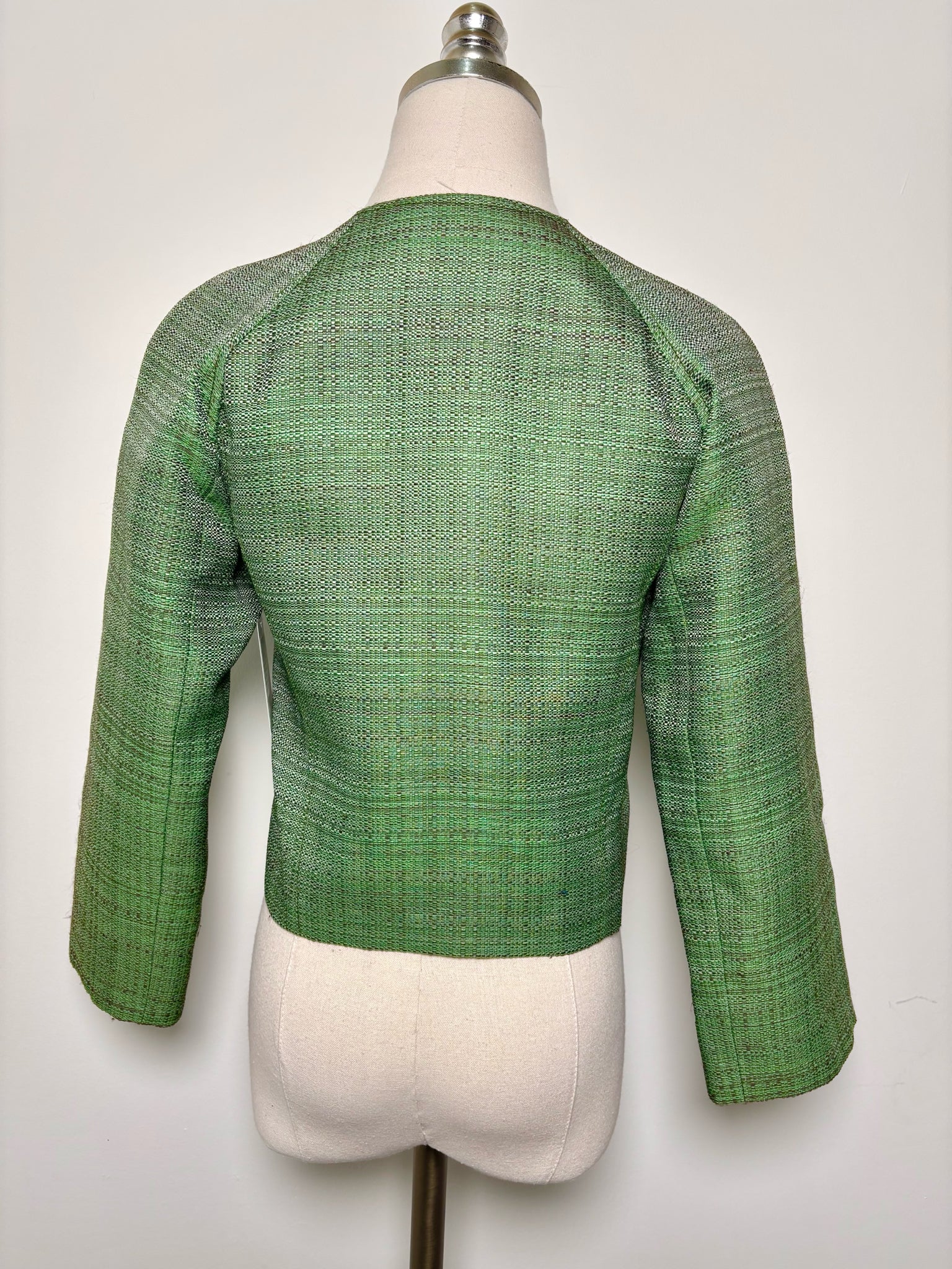 Carolina Herrera green tweed snap button cropped collarless evening jacket. Pre-owned.