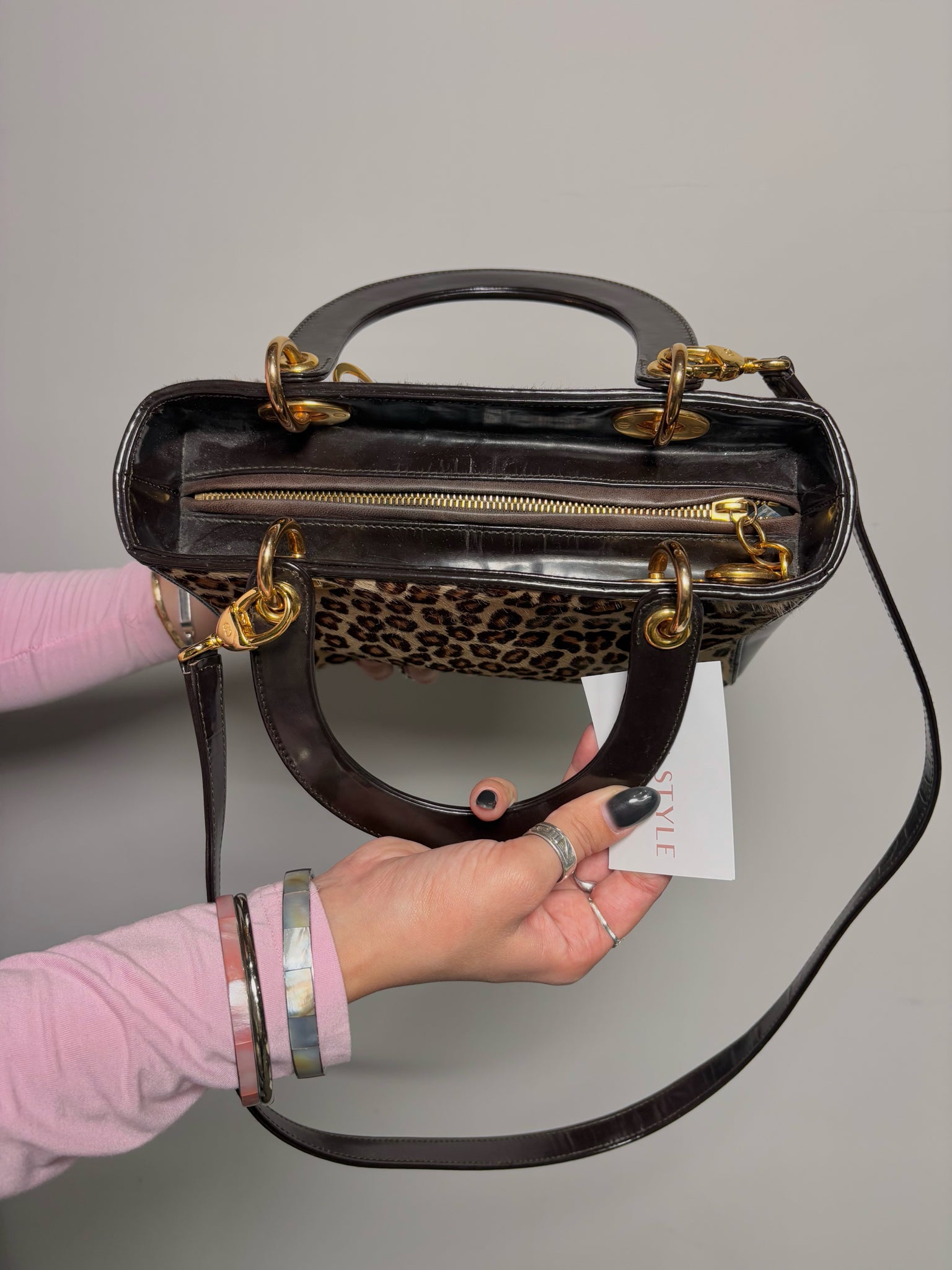 Iconic and collectible, this Christian Dior Lady Dior purse from the 1997 John Galliano collection features brown ponyhair leather with a bold animal print. Detailed with gold-tone hardware, a top zipper closure, and four protective brass feet, it exemplifies the house’s signature elegance and timeless craftsmanship.