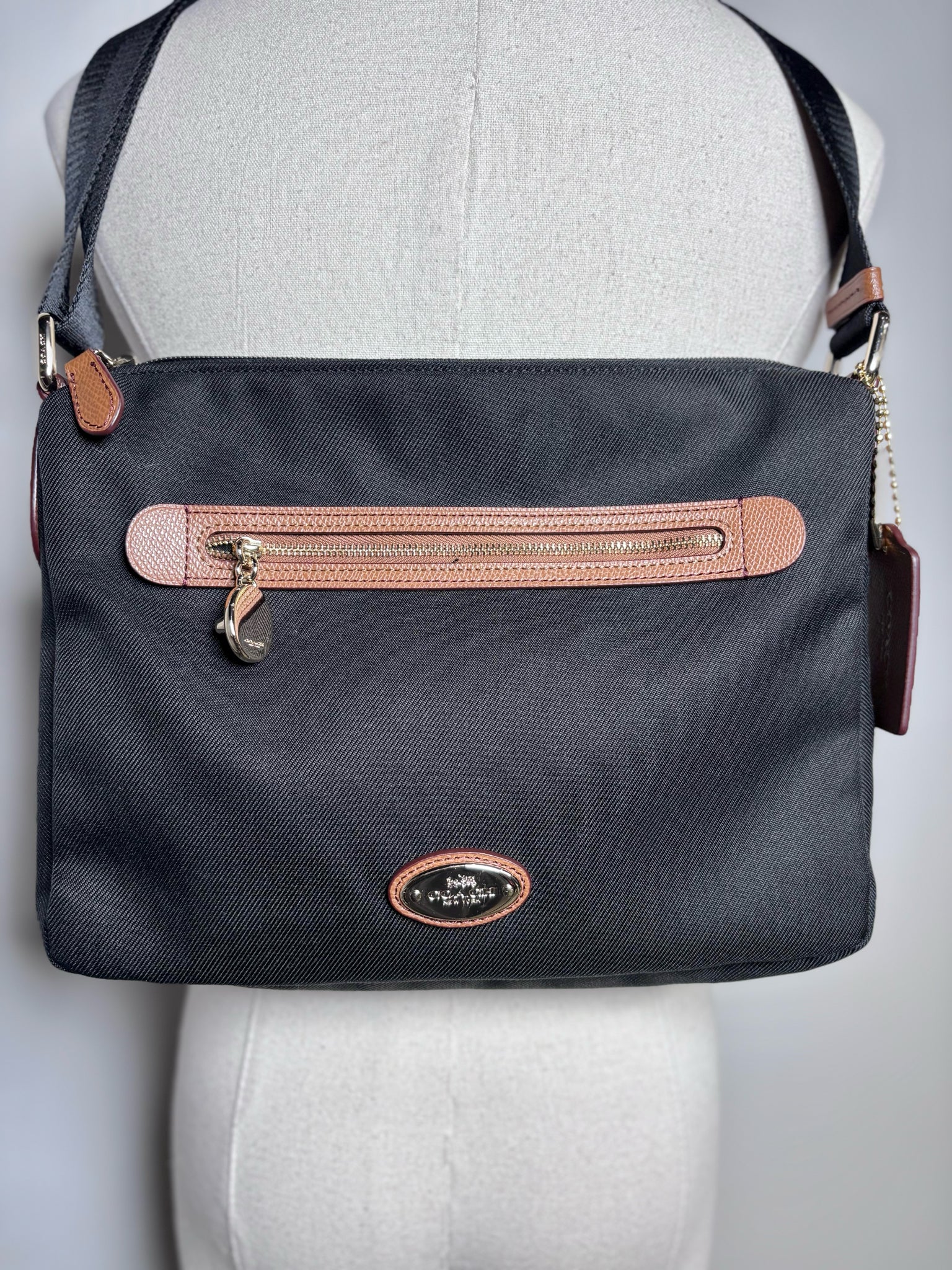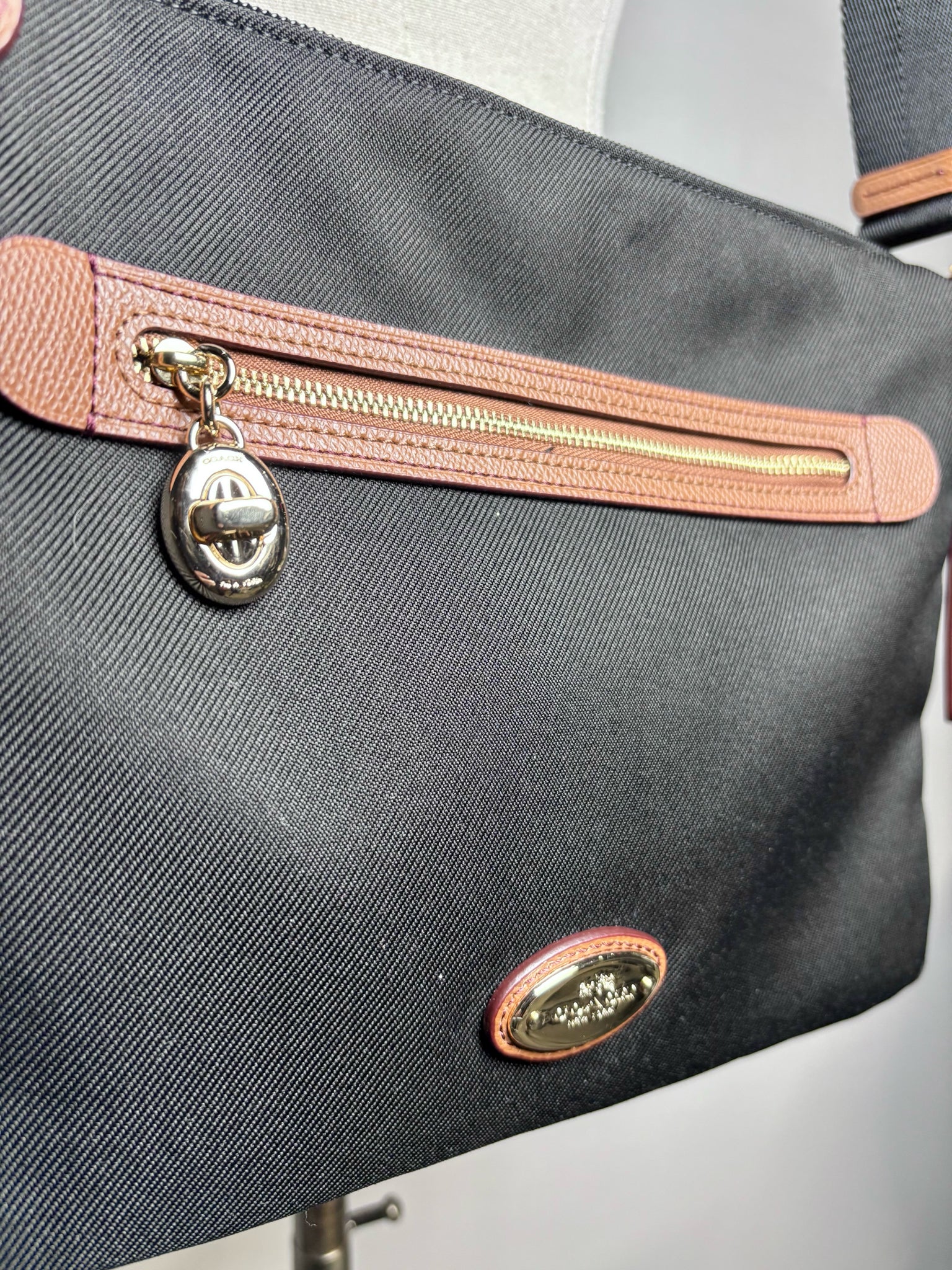 The Coach Sawyer crossbody offers a timeless, practical design crafted from durable black canvas with rich brown leather trim. Featuring a secure top zipper closure and an adjustable shoulder strap for comfortable wear, the interior includes three pockets to keep essentials neatly organized. A versatile everyday piece that blends classic Coach craftsmanship with effortless functionality.