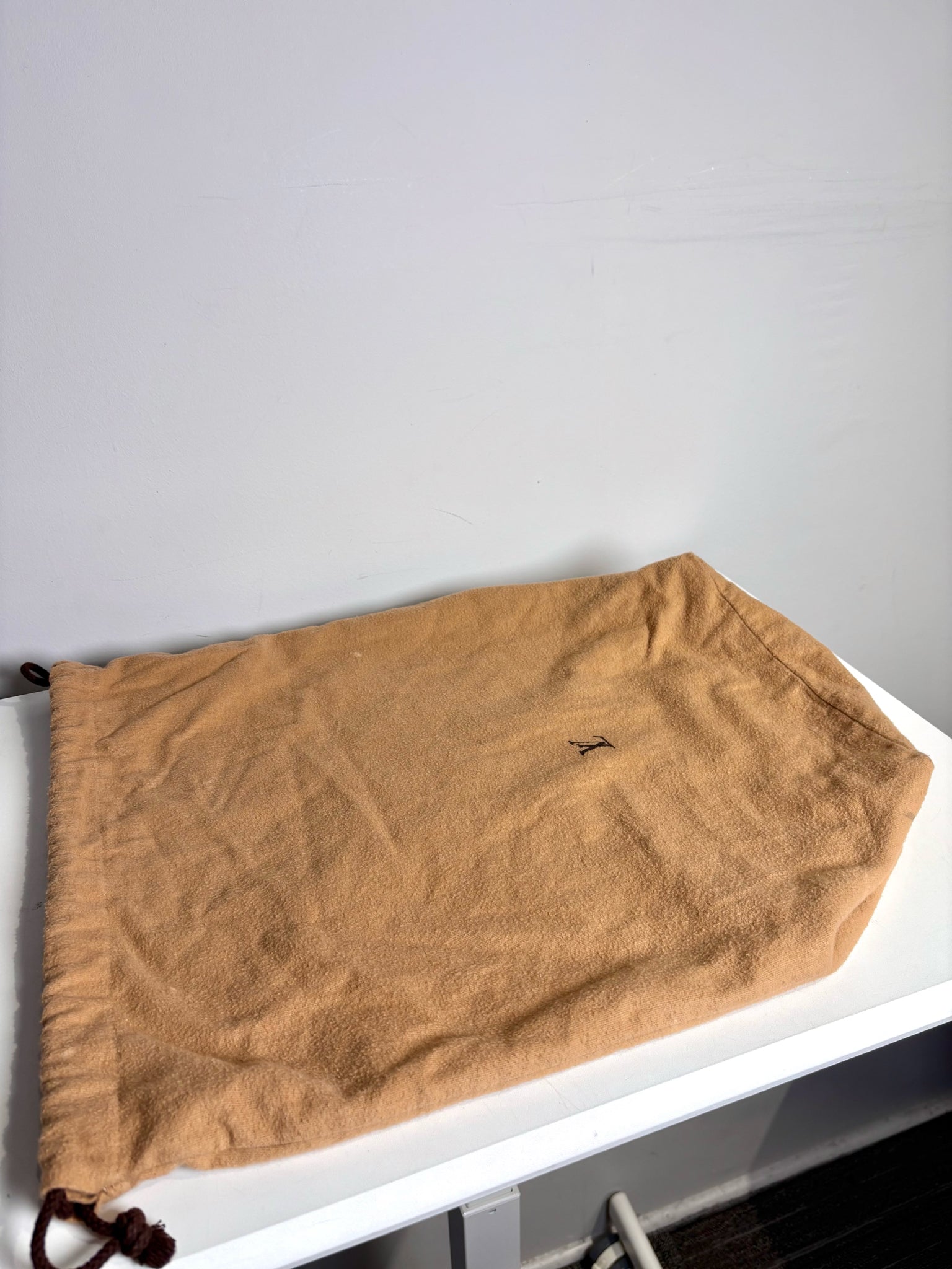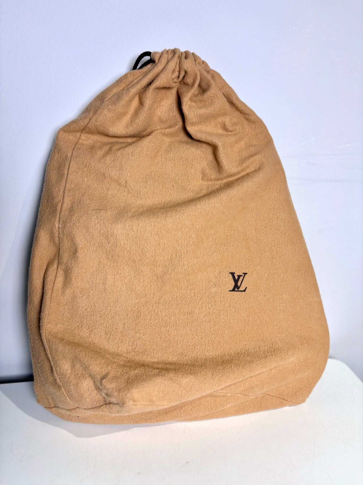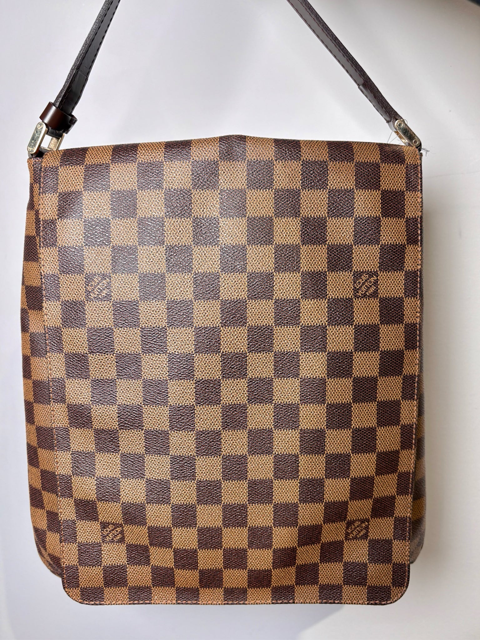 Classic and utilitarian, this Louis Vuitton Musette GM crossbody messenger from 2004 is crafted from Damier Ebene brown coated canvas and features an adjustable brown leather shoulder strap, polished brass hardware, and a front flap opening to a brick red partitioned interior with pockets and an interior D-ring, offered in a large size and accompanied by the dust bag and certificate of authenticity; approximate measurements are 12.5" base length, 14.75" height, 1" width, and an 18" strap drop.