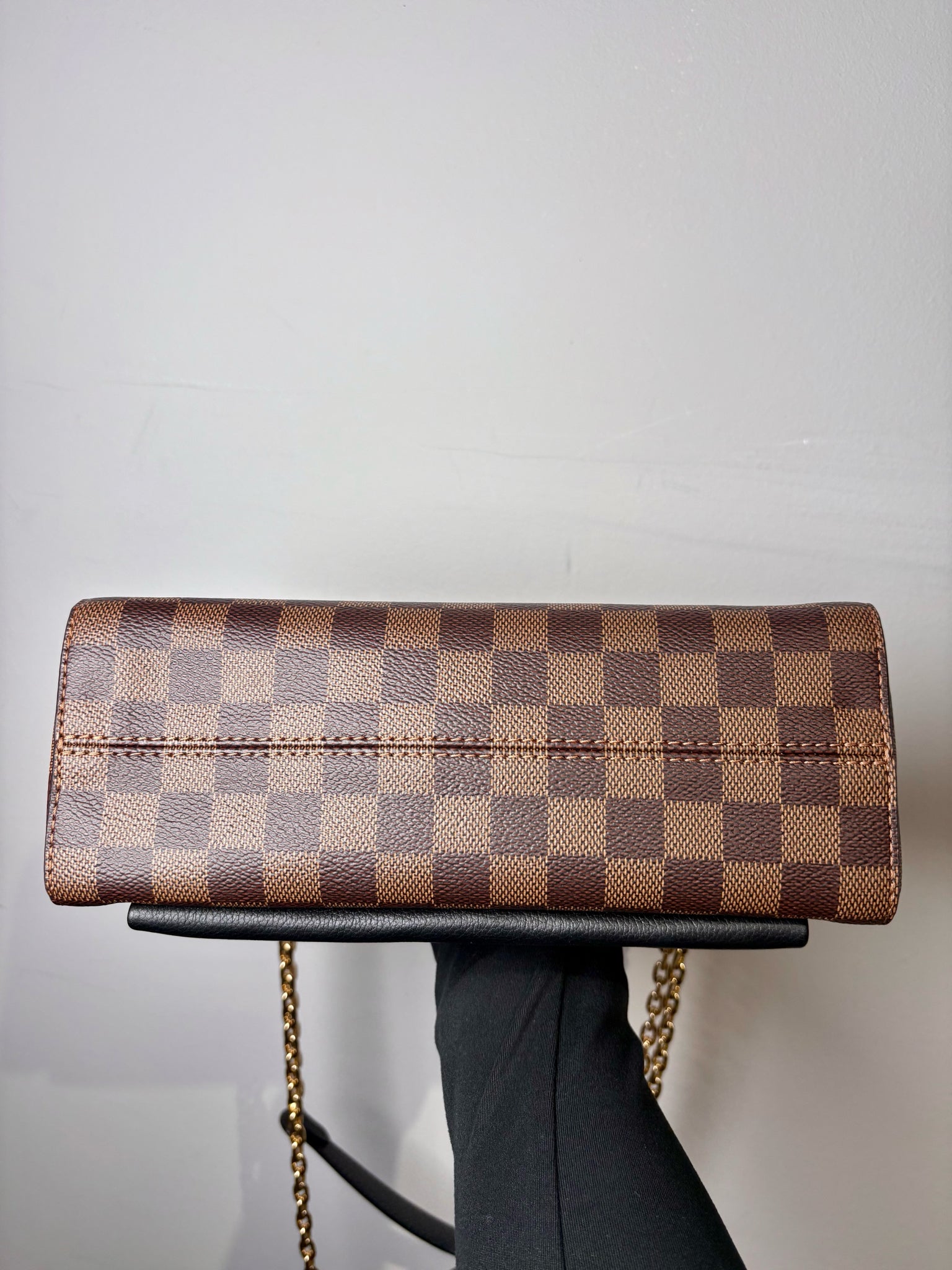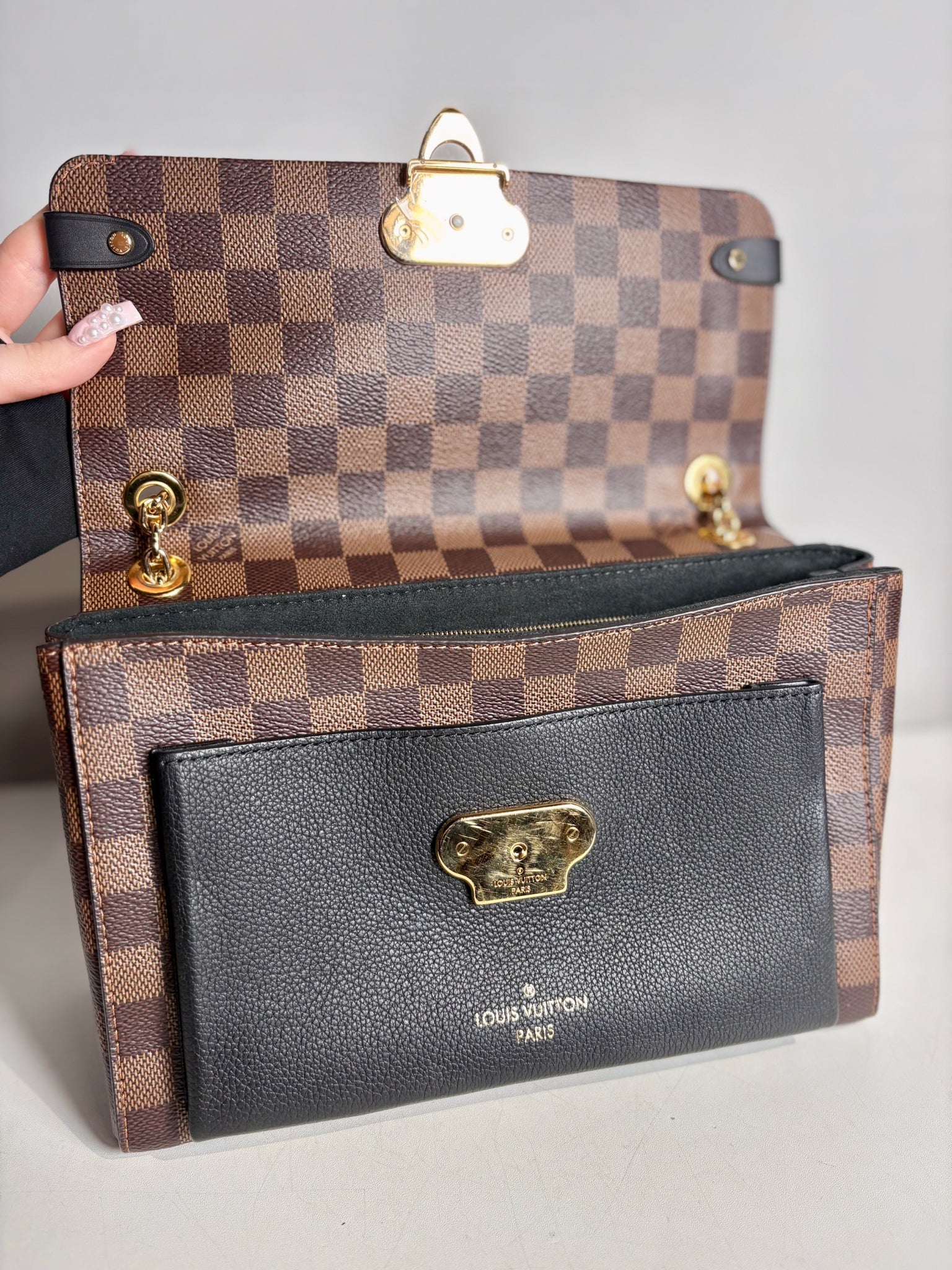 Timeless and refined, this Louis Vuitton Vavin PM shoulder bag is crafted from Damier Ebene brown coated canvas with leather trim, featuring a front pocket, a crossover flap with brass magnet closure, and a polished brass chain-link shoulder strap with black leather shoulder pads, complemented by an interior zipper pocket and Alcantara lining, offered with the dust bag and certificate of authenticity.