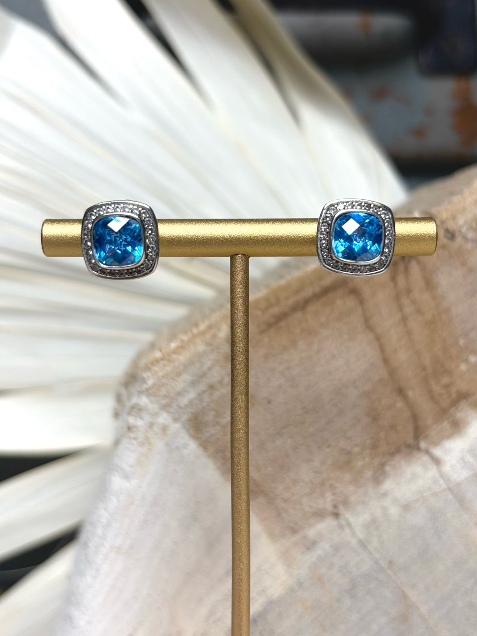Delicate and luminous, these David Yurman stud earrings feature 5mm cushion-cut blue topaz center stones framed by 0.17 ctw of sparkling diamonds. Crafted in sterling silver 925, they offer timeless elegance for pierced ears.