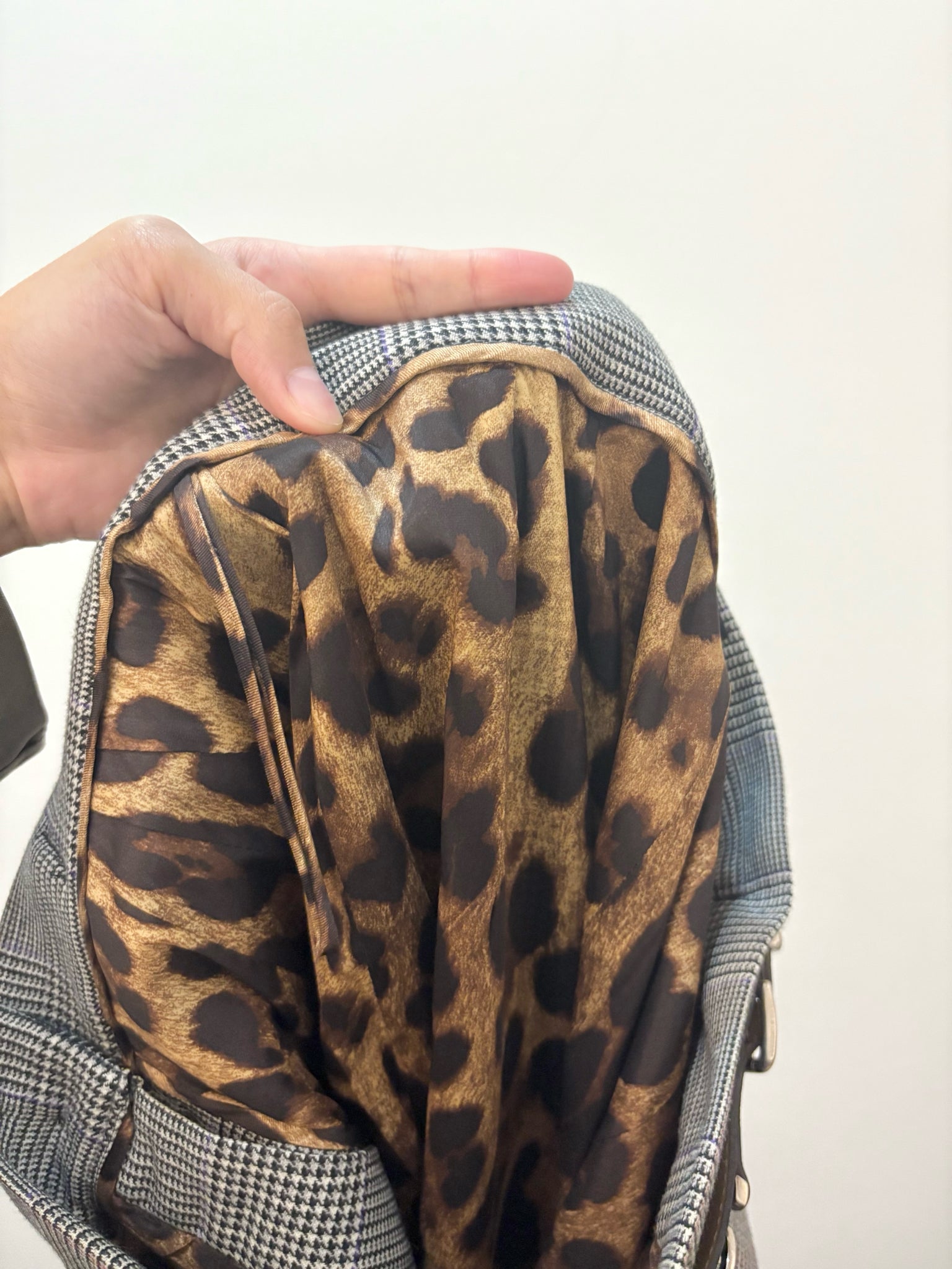 Dolce & Gabbana gray plaid fully lined in animal print skirt with D&G metal logo side buckles and black patent leather trim in a size 46/10 US.
