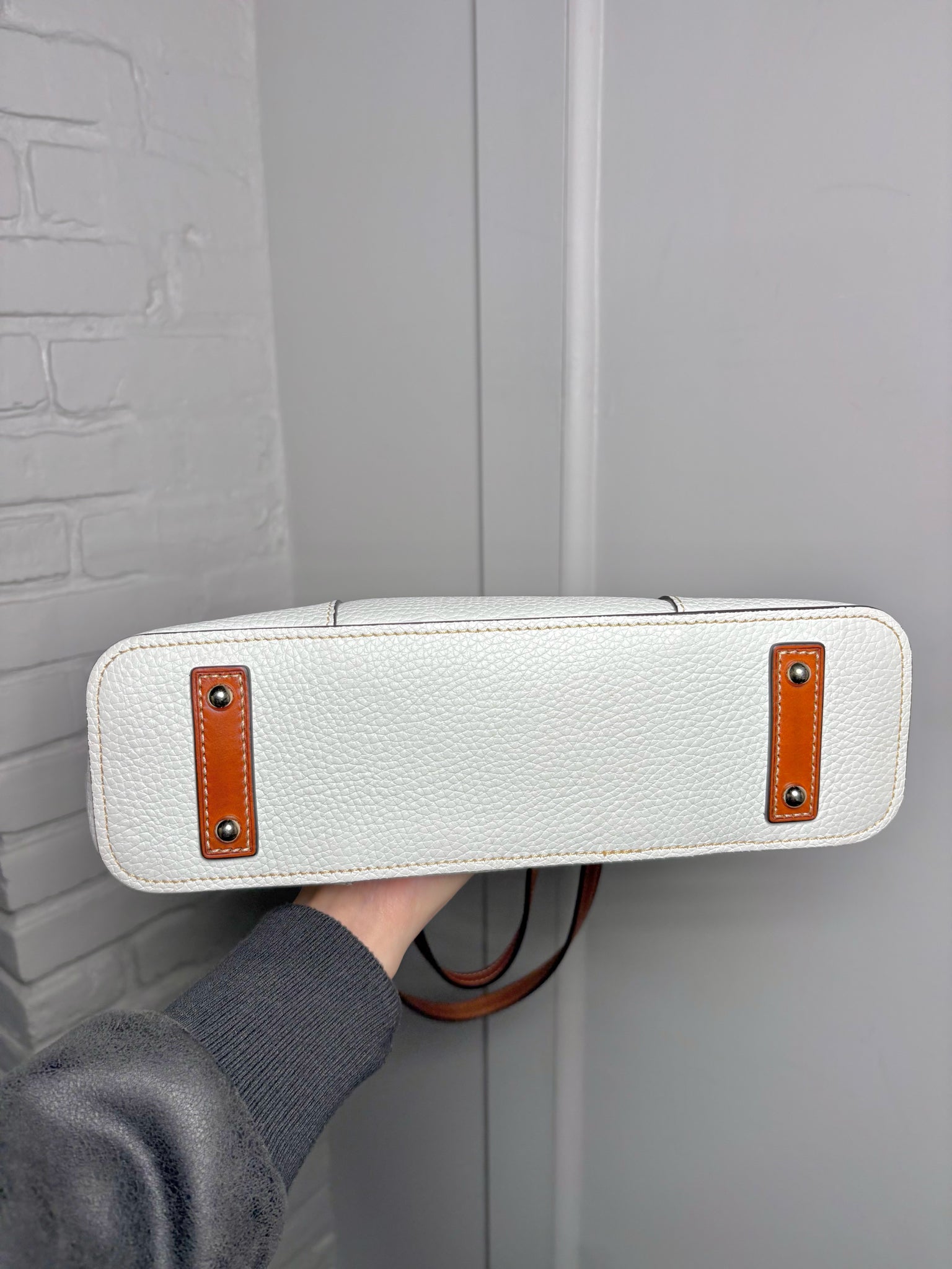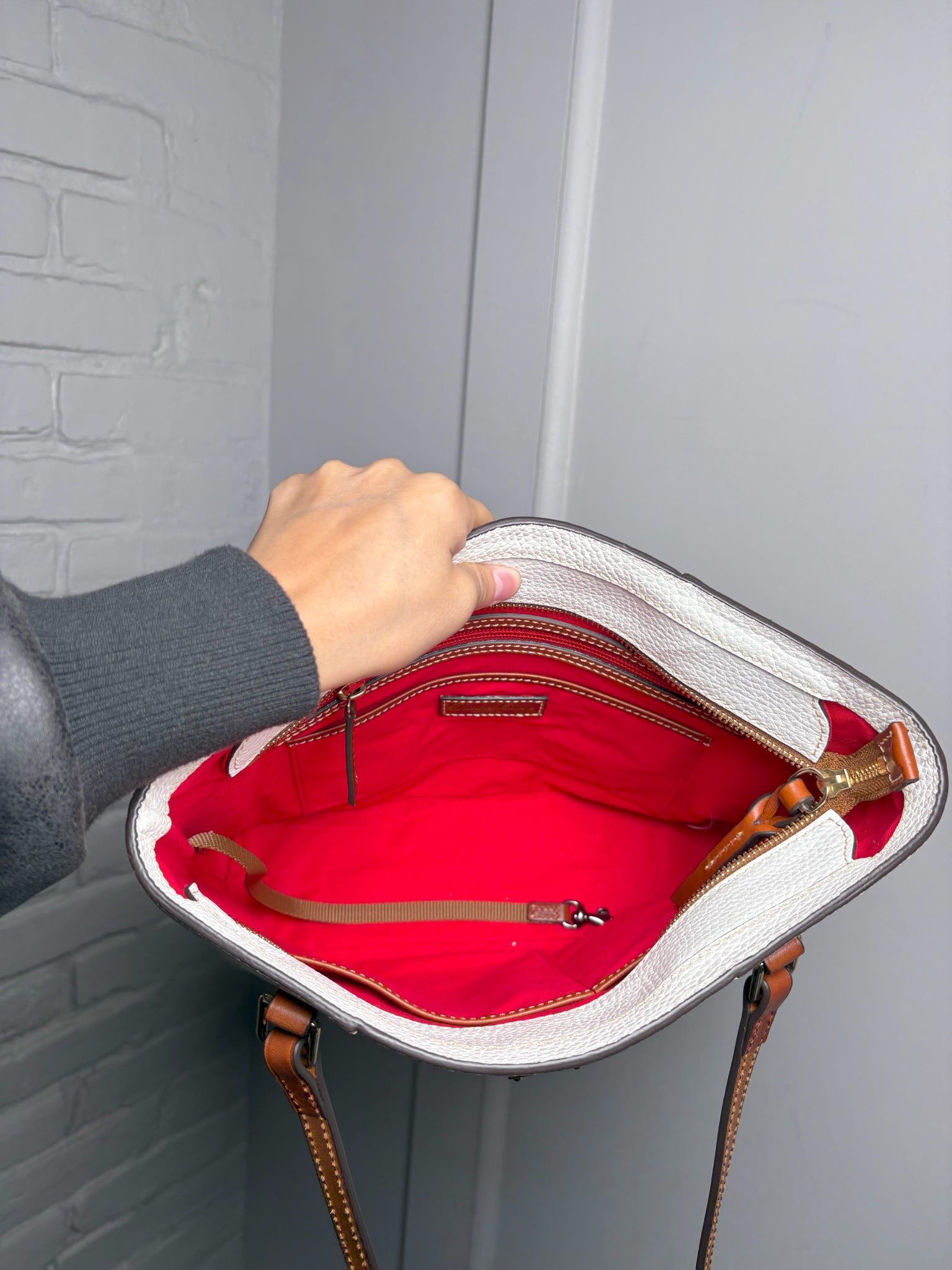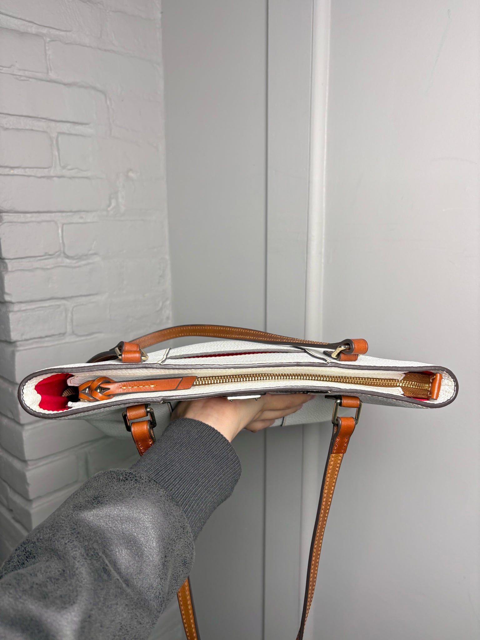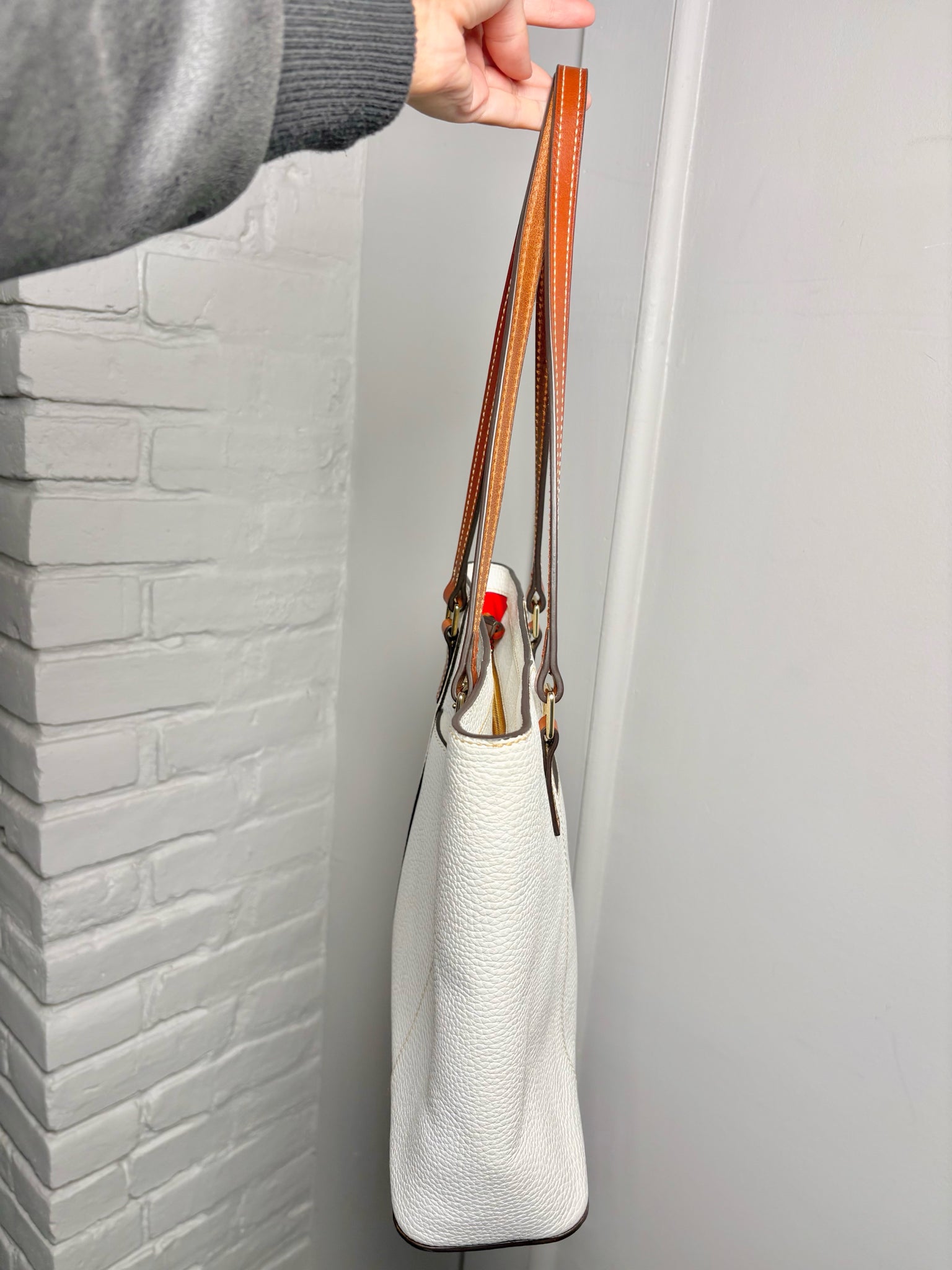 Dooney & Bourke white pebble grain leather tote bag with double brown handles, front pocket, brass feet and red lining.