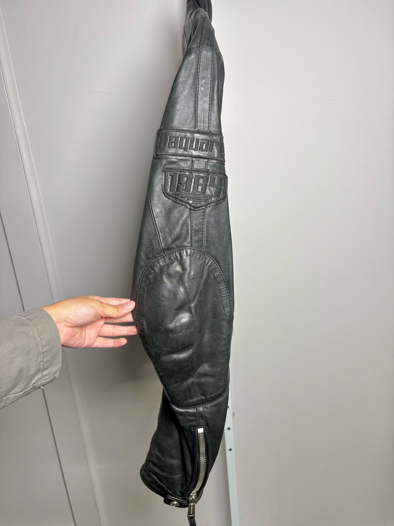 Vintage 1964 Dsquared black leather jacket showcasing timeless craftsmanship and rugged sophistication. Designed with a front zip closure, silver-tone hardware, and distinctive arm and elbow patches, this piece exudes heritage biker appeal. Fully lined in cotton for comfort. Size M/L — a rare collectible from Dsquared’s early design era.