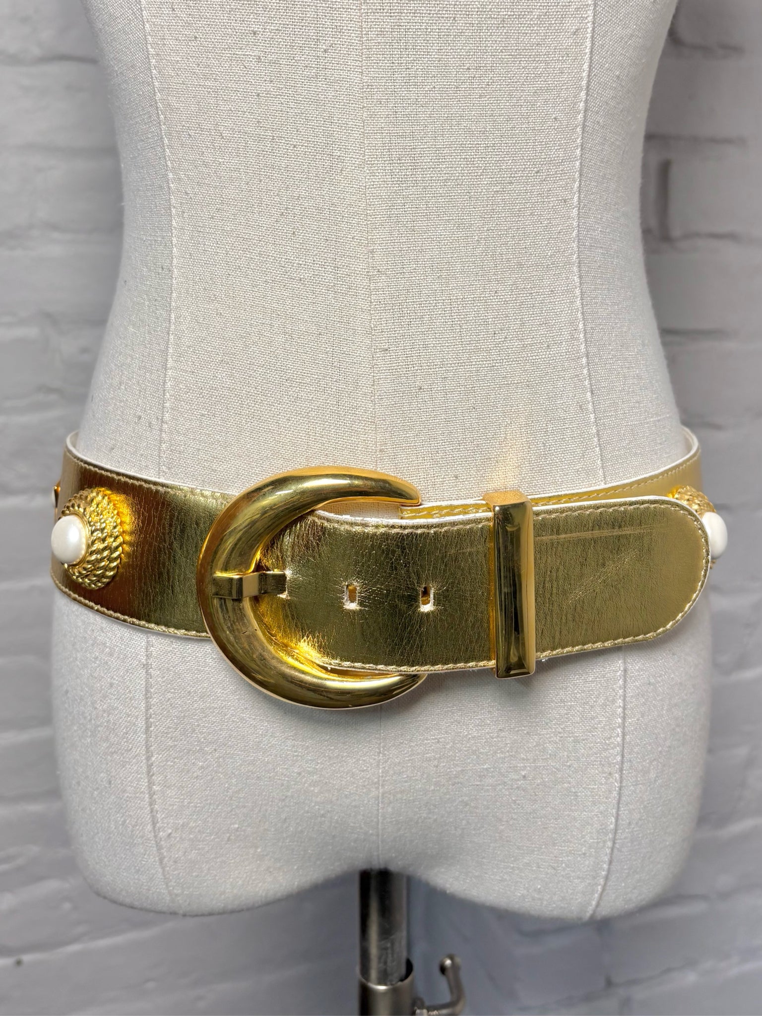 Vintage Escada Metallic Gold Belt — A striking statement piece in metallic gold, adorned with pearl accents and gold-tone hardware. Crafted in a size 40 (Small), this vintage Escada belt captures timeless glamour with signature sophistication.