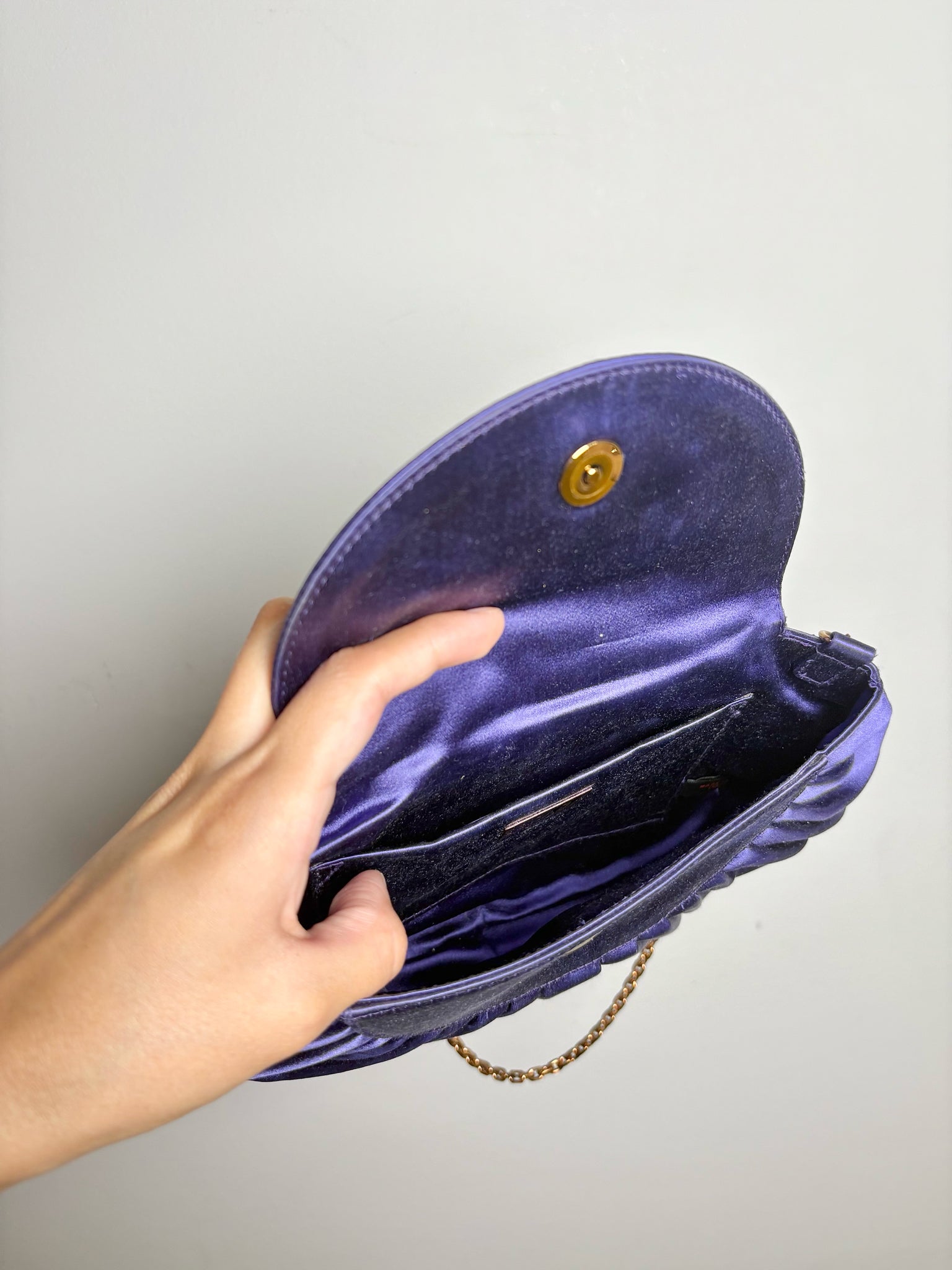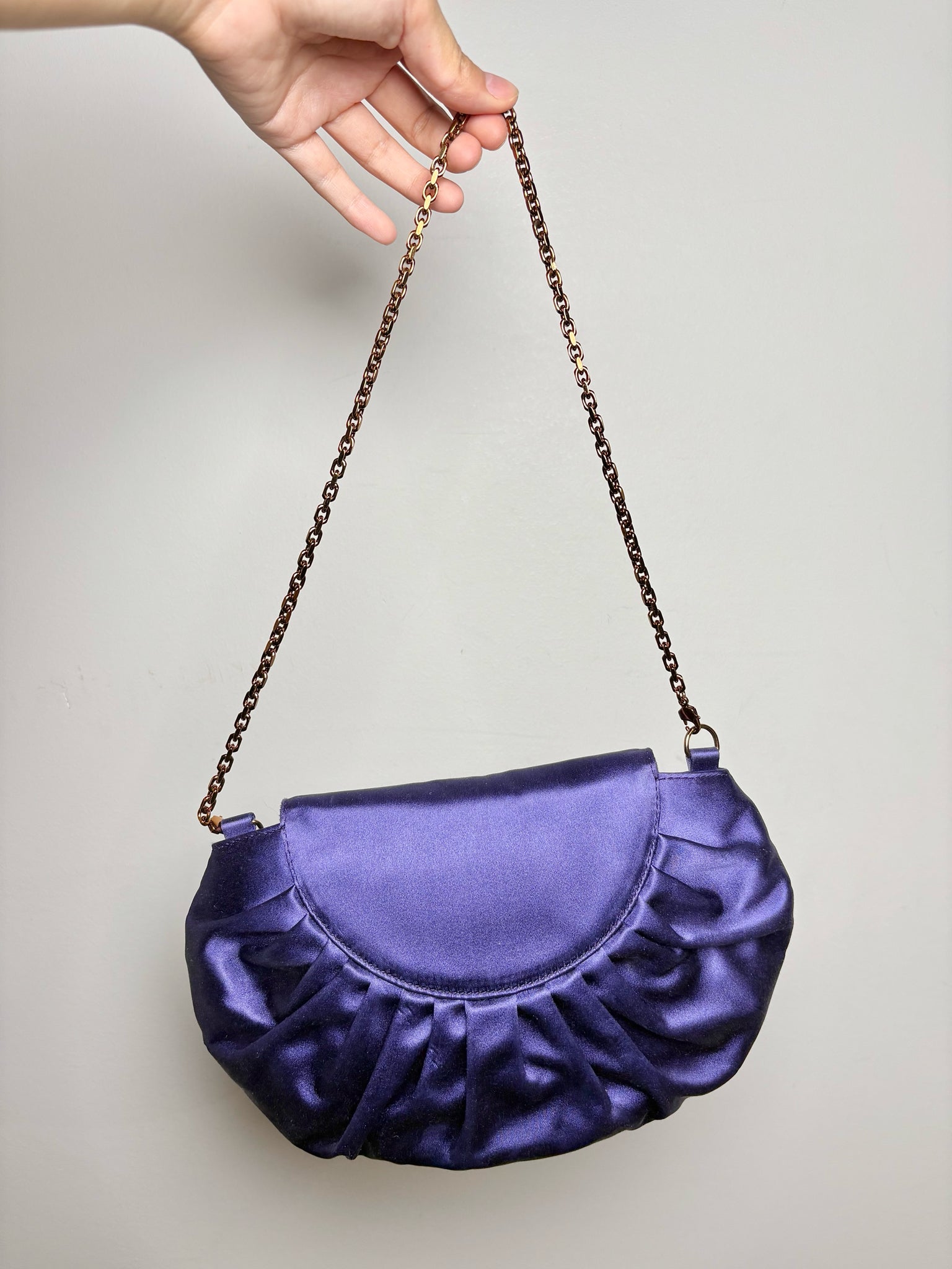Escada purple satin mini pleats top flap rose gold tone detachable chain purse with snap button and an interior slot.