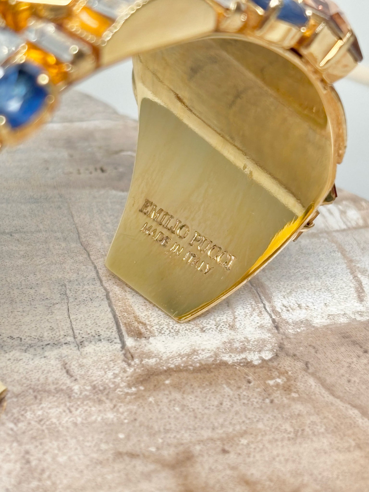 Elevate your collection with this vintage Pucci cuff bracelet, masterfully crafted in gilded brass and adorned with multi-hued jewelry glass stones. The bold, sculptural design captures Pucci’s signature flair for vibrant sophistication, while the weighty, high-quality metal ensures timeless durability. Pre-owned