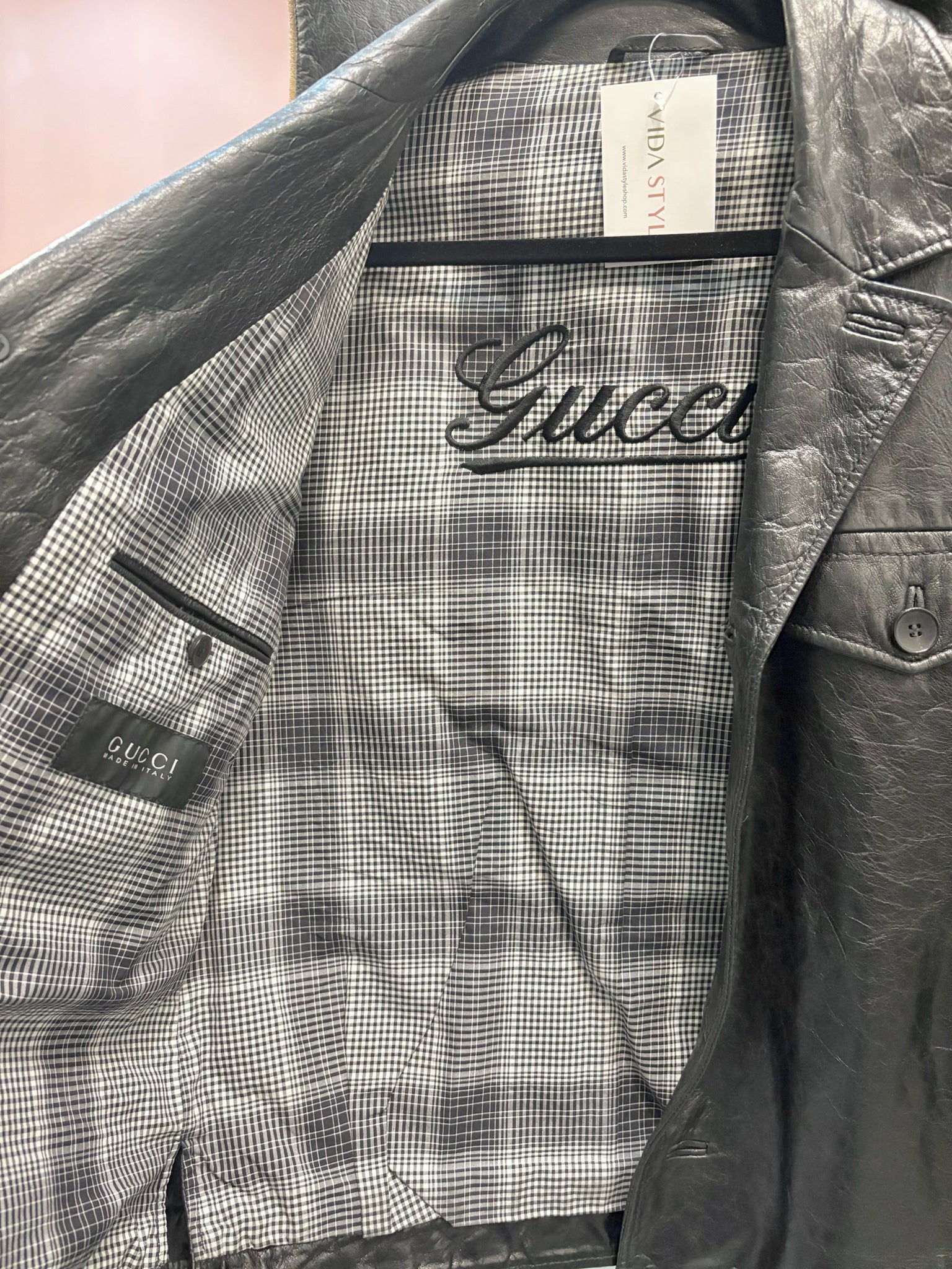 Vintage Gucci black leather button-down men’s jacket, expertly tailored with sharp V-lapels and understated GUCCI embroidery for a discreet touch of heritage luxury. Crafted in supple leather and fully lined in soft cotton, this piece embodies timeless Italian refinement and effortless masculinity. Size 48/Medium US.