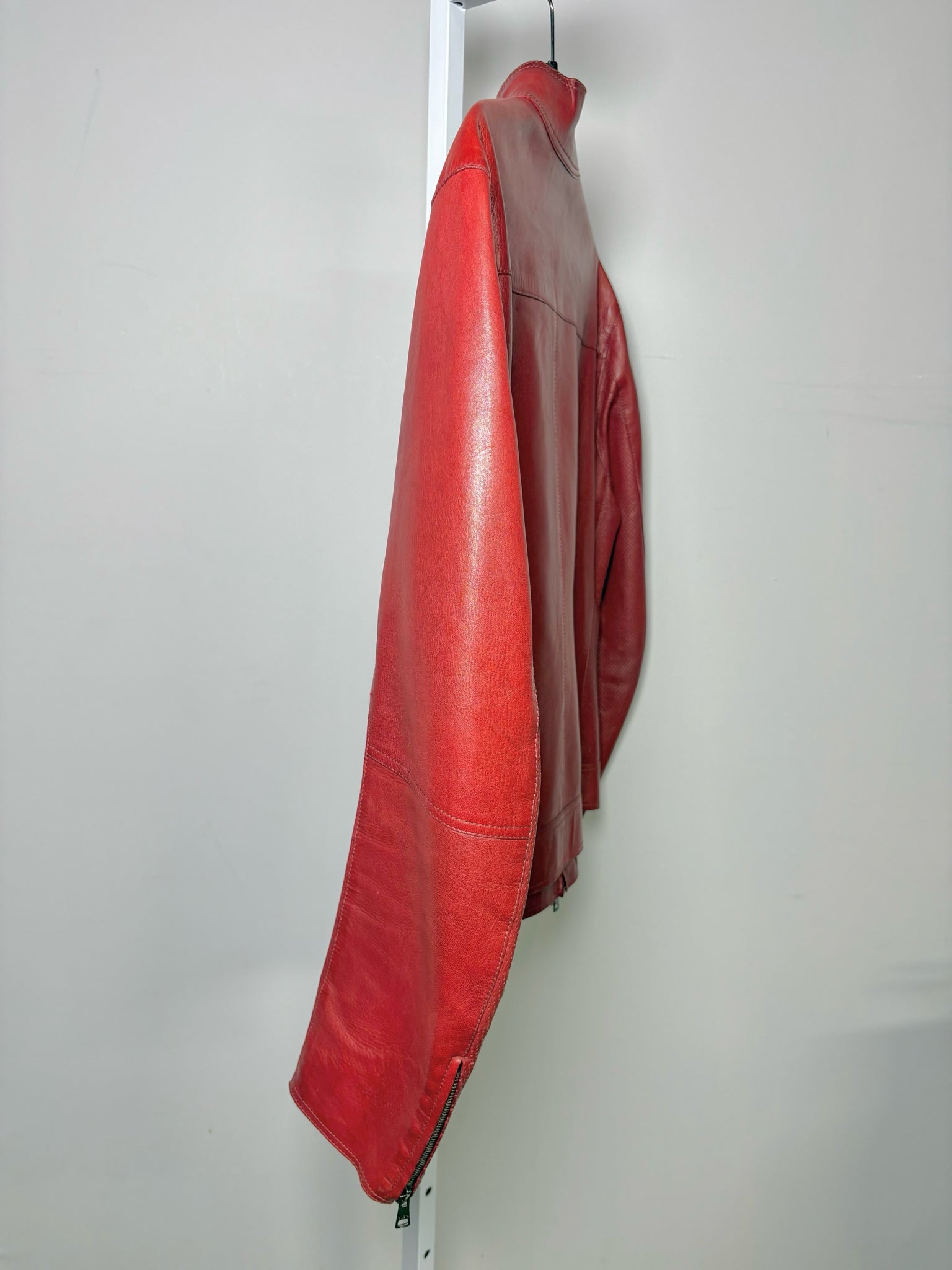Gucci burgundy leather zip-up moto jacket featuring a sleek silhouette with a silver-tone neck buckle and perforated detailing for a refined, edgy finish. Size XL. Stains on the sleeve, priced as-is.