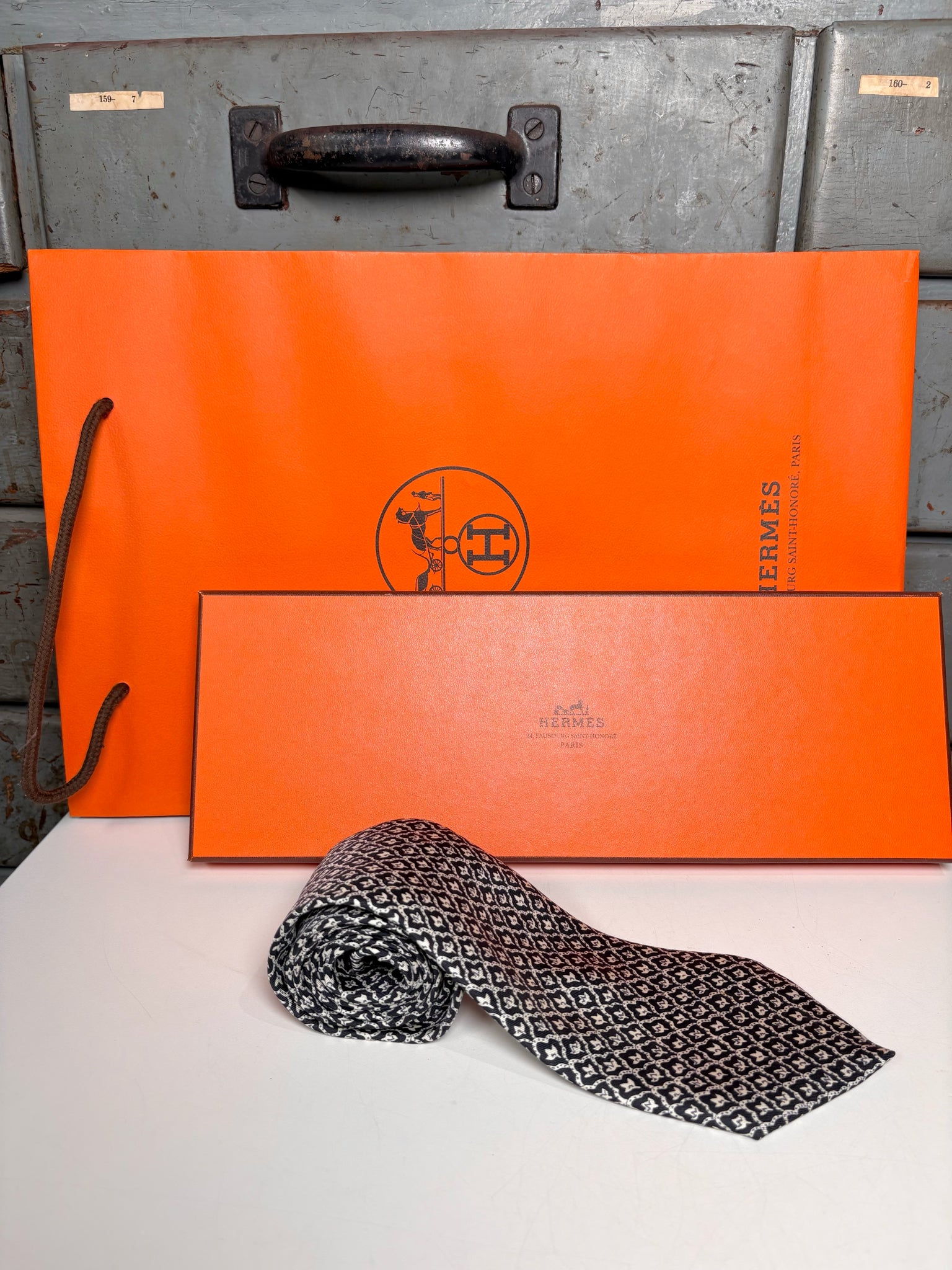 Hermes black 100% men's tie with white leaves motif. Comes with the original box and paper bag.
