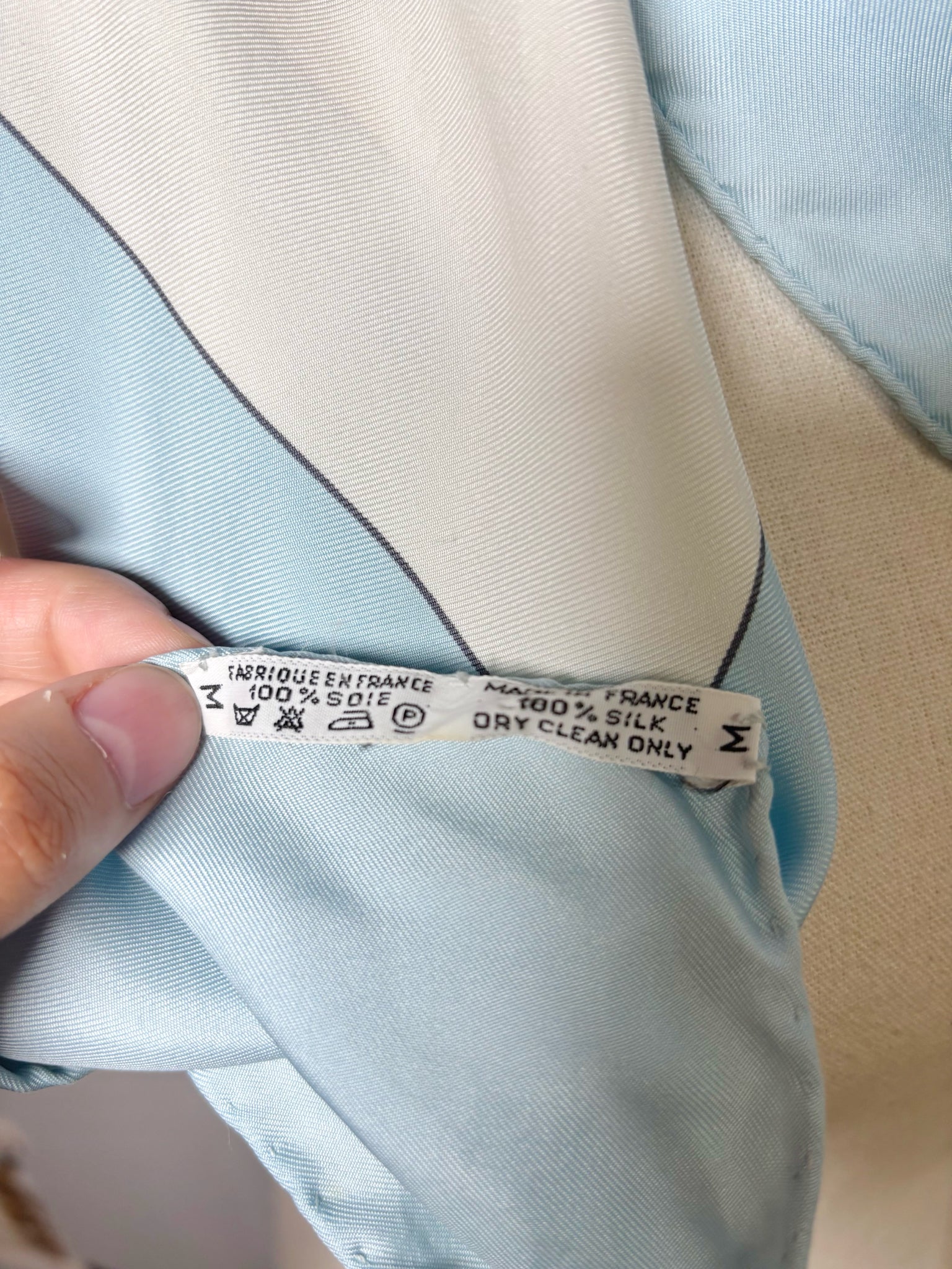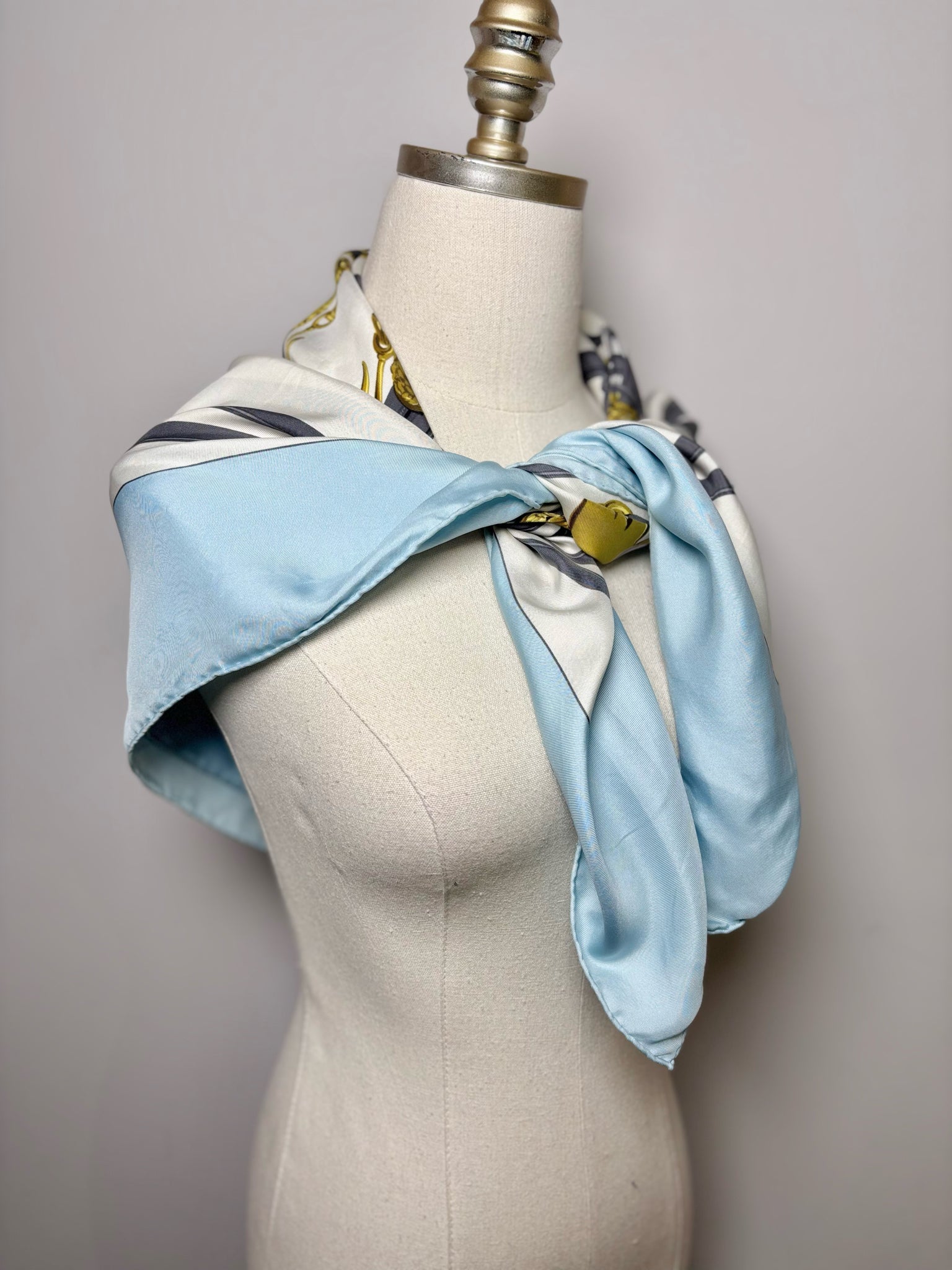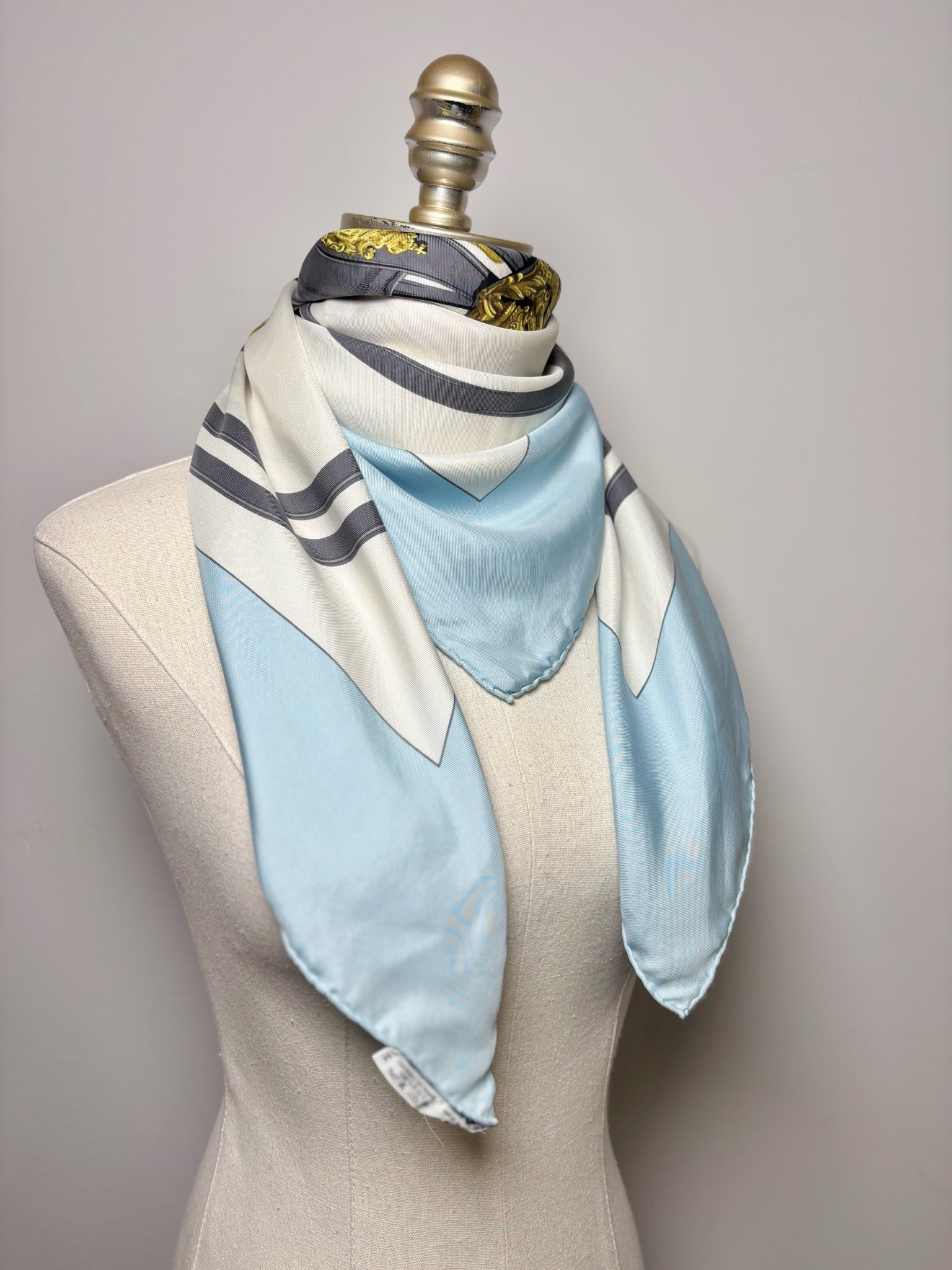 Hermes blue, white, gold and gray horse and chains 100% silk Brides de gala hand rolled 90 cm scarf. It is a collectors item. Priced as-is (see pictures for more details).