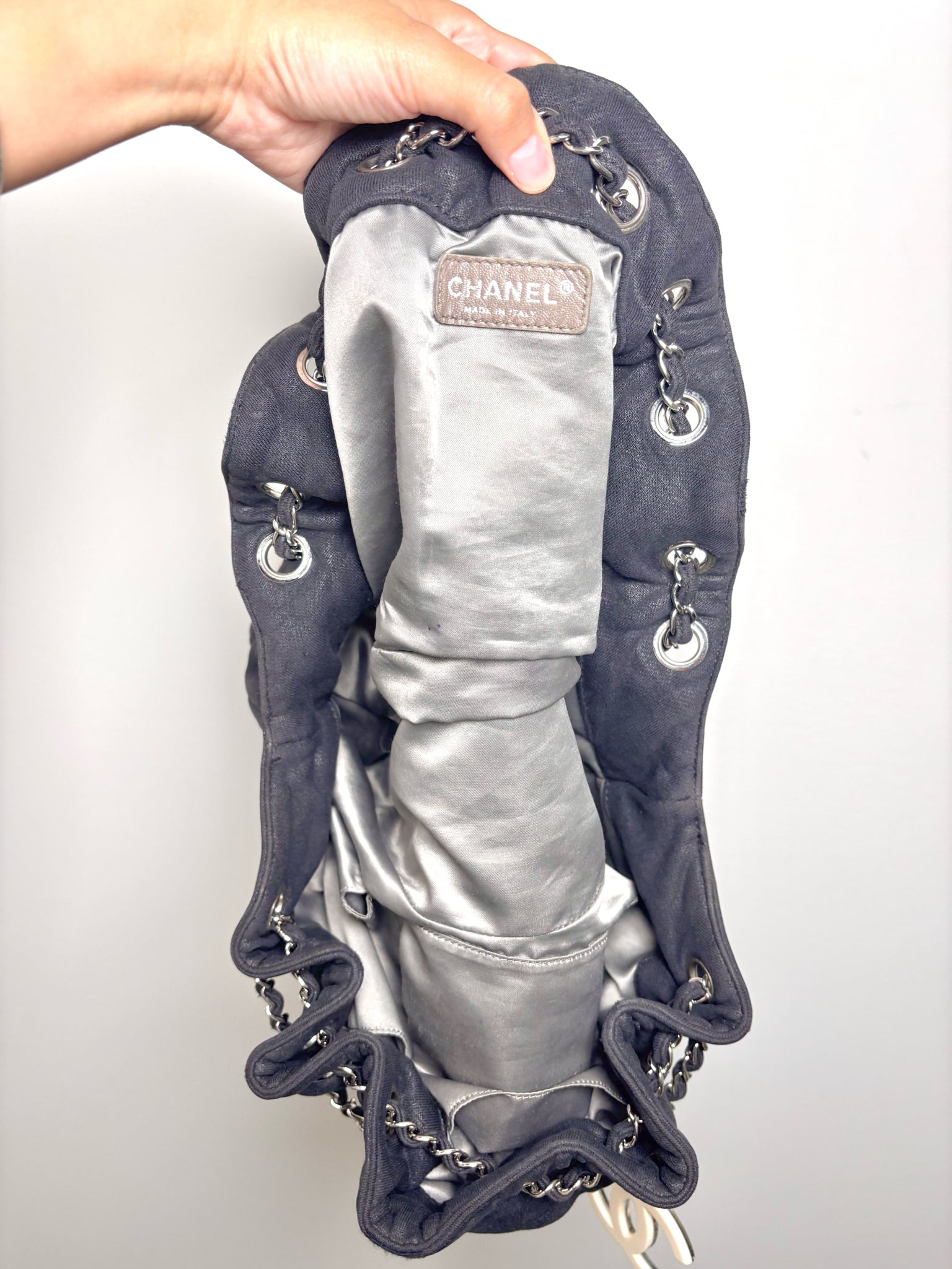 Chanel Cruise Collection 2008 jersey cloth fabric, diamond quilted bottom bag with grey satin lined interior, cinch style silver chain link strap and black/white resin CC charm. Pre-owned.