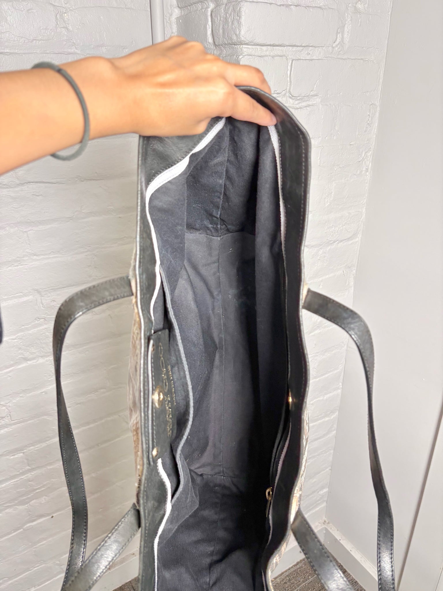 Jimmy Choo brown, white, tan, and black canvas tote bag. Leather trim with gold tone hardware.
