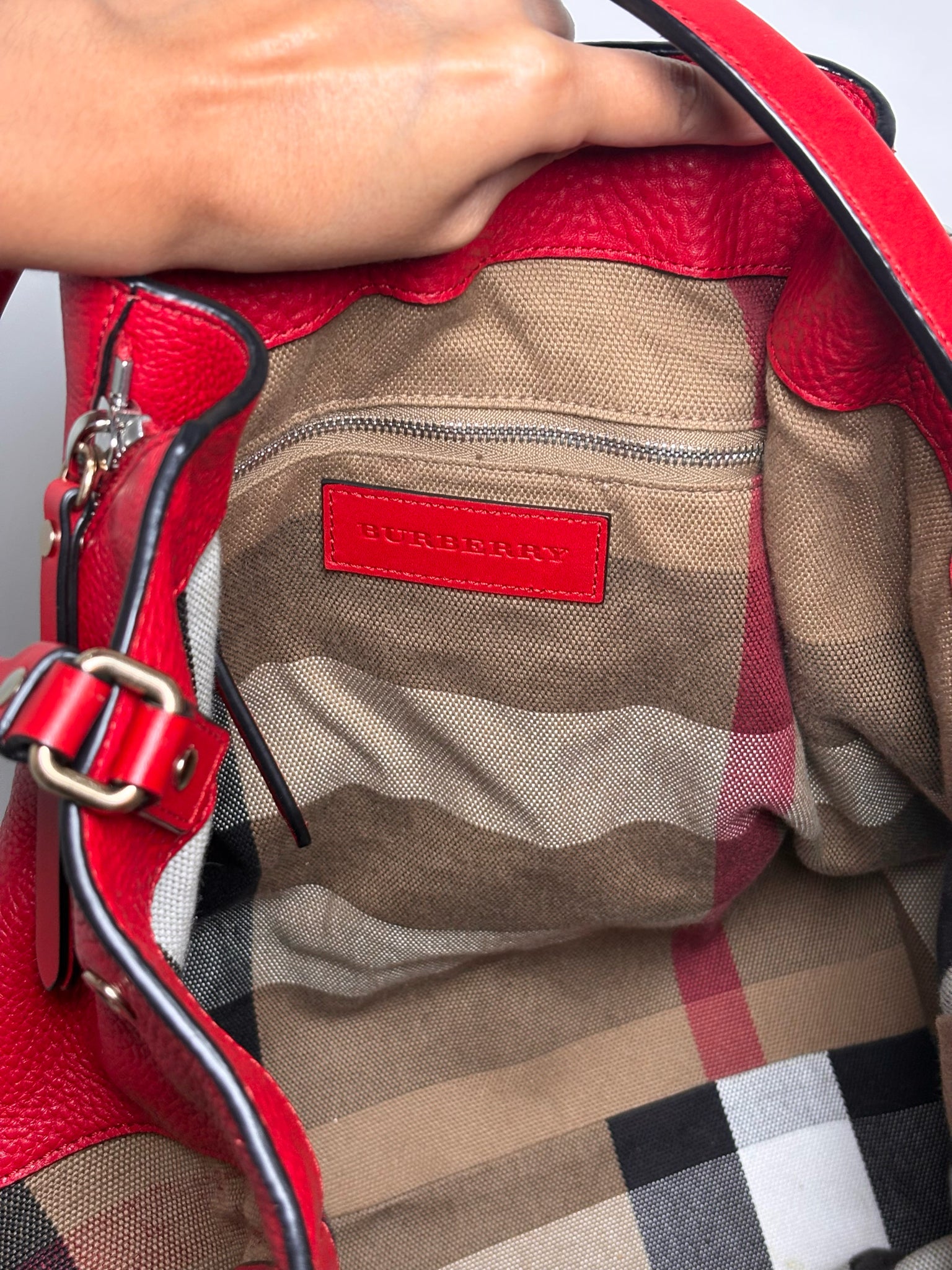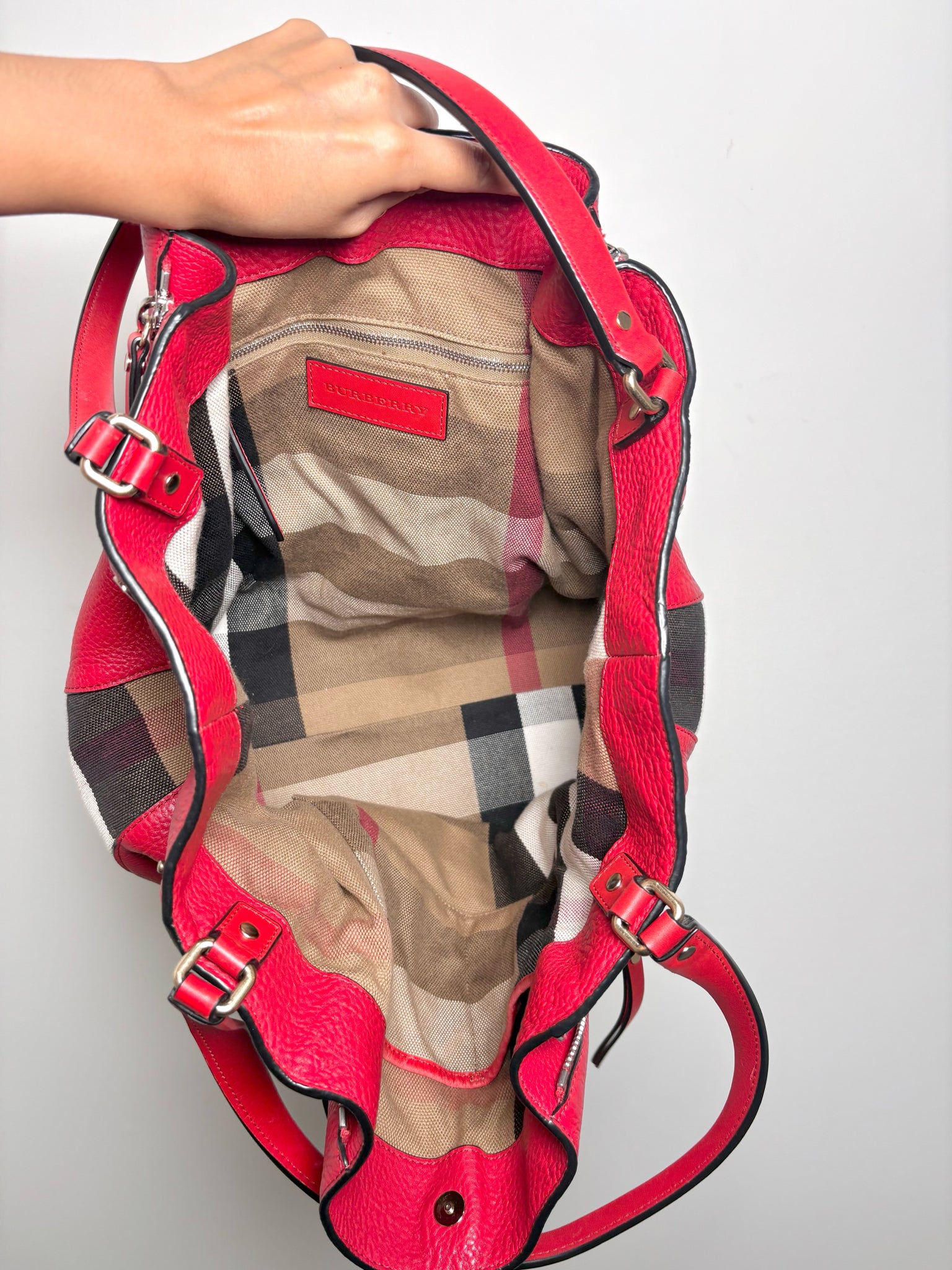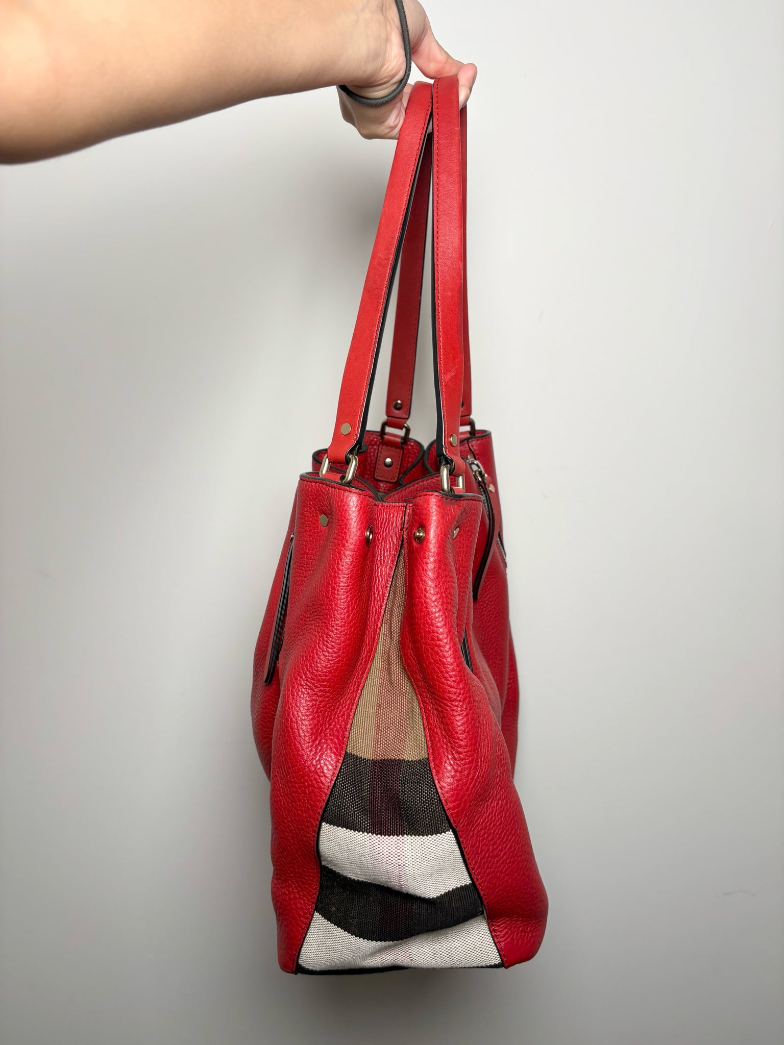 - Red leather with canvas check print sides and interior
