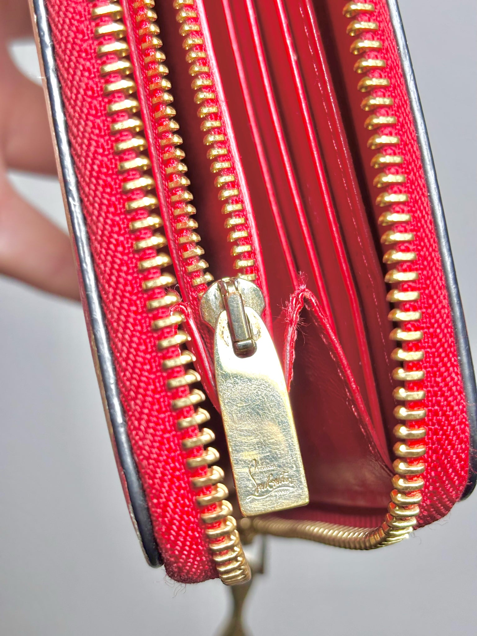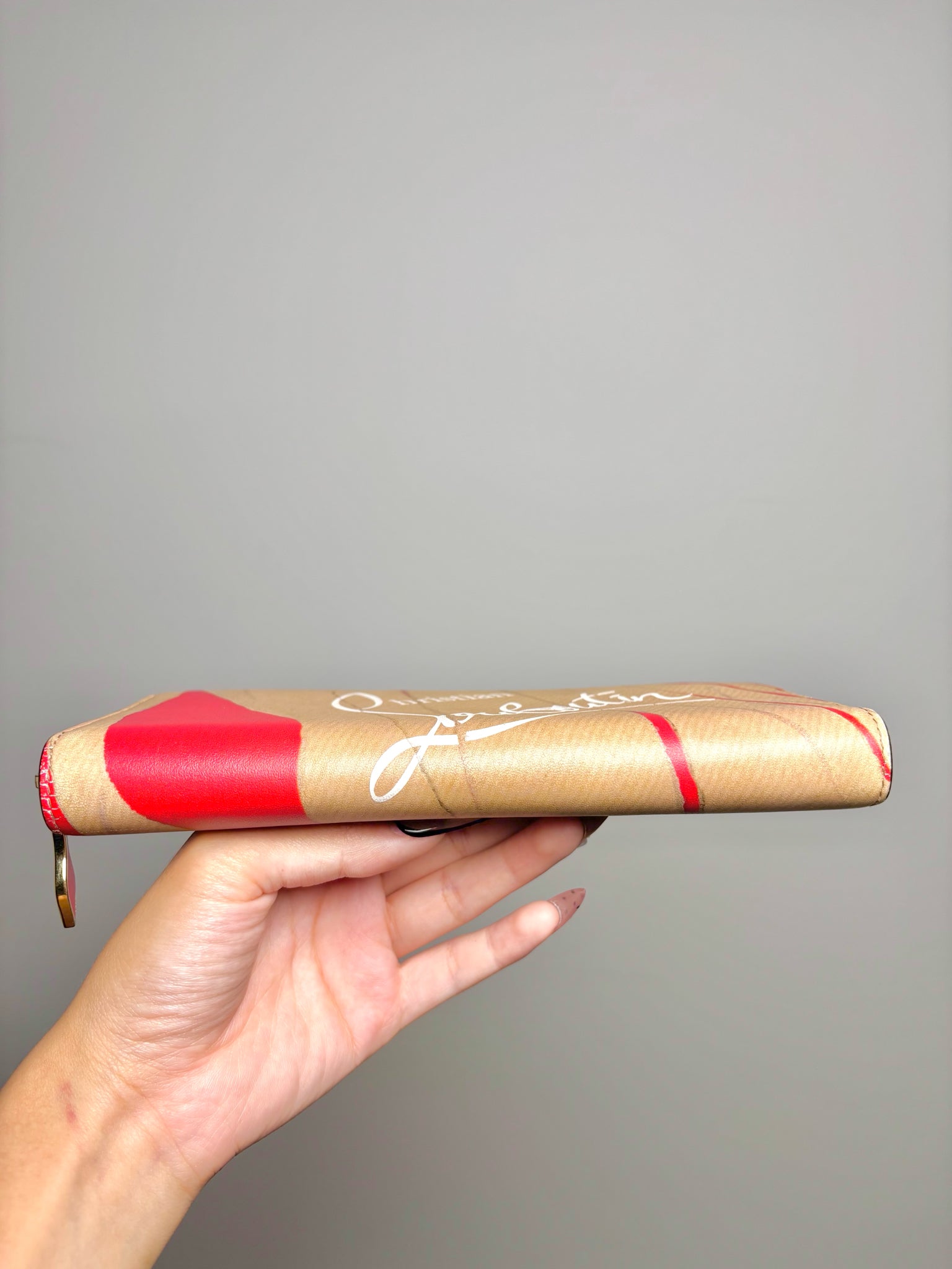 This Christian Louboutin continental wallet is crafted in tan and red printed leather, showcasing the brand’s signature bold aesthetic. Designed with a zip-around closure, it opens to a spacious interior perfect for organizing cards, cash, and essentials—an effortlessly chic accessory that embodies Louboutin’s timeless luxury.