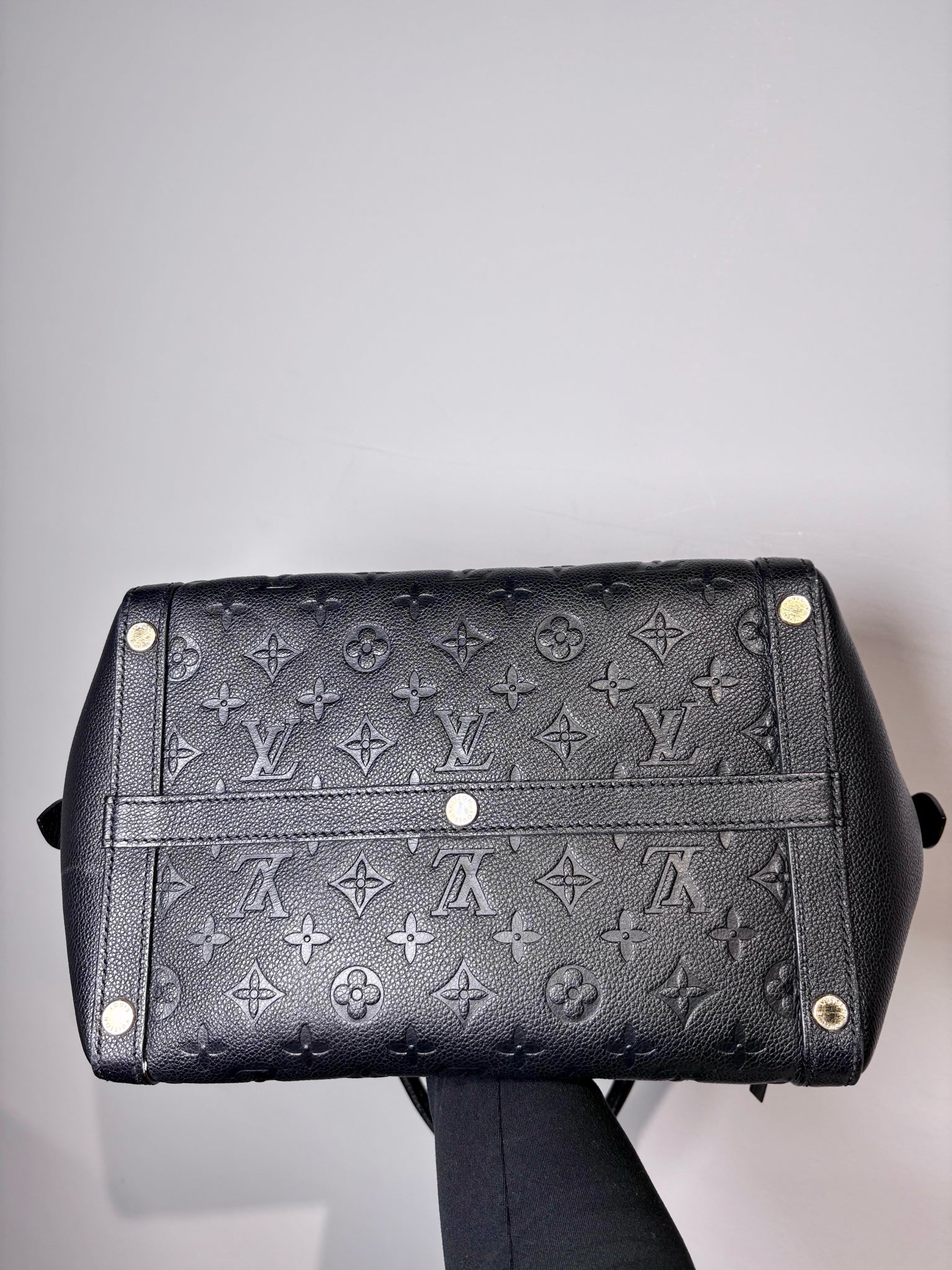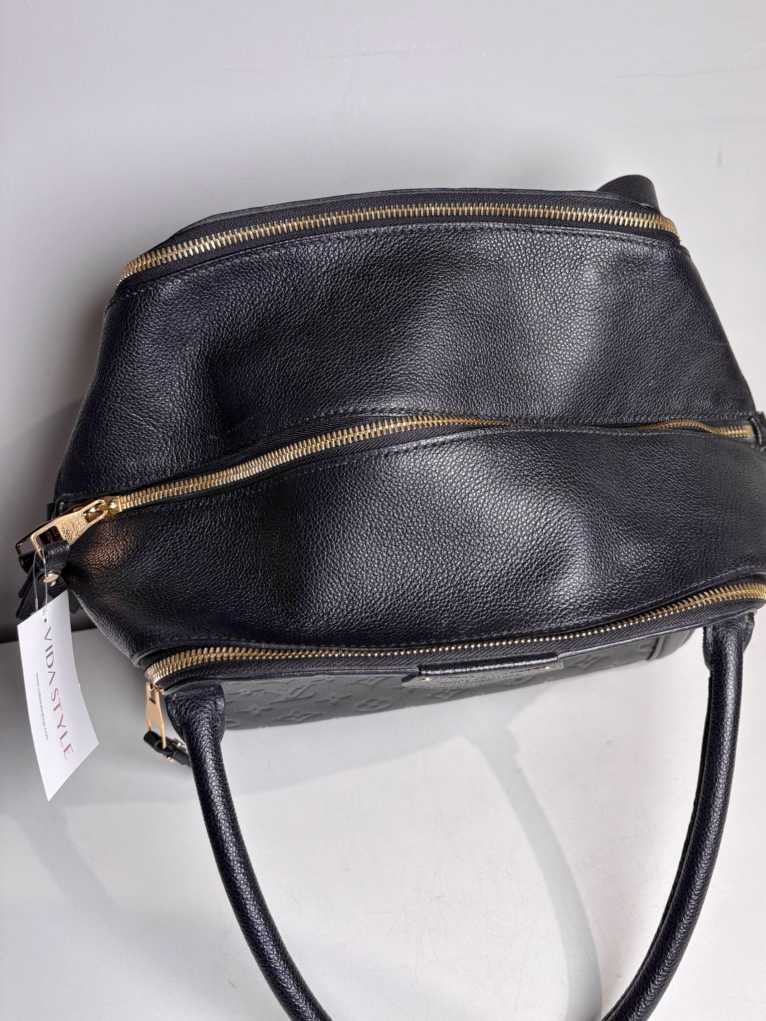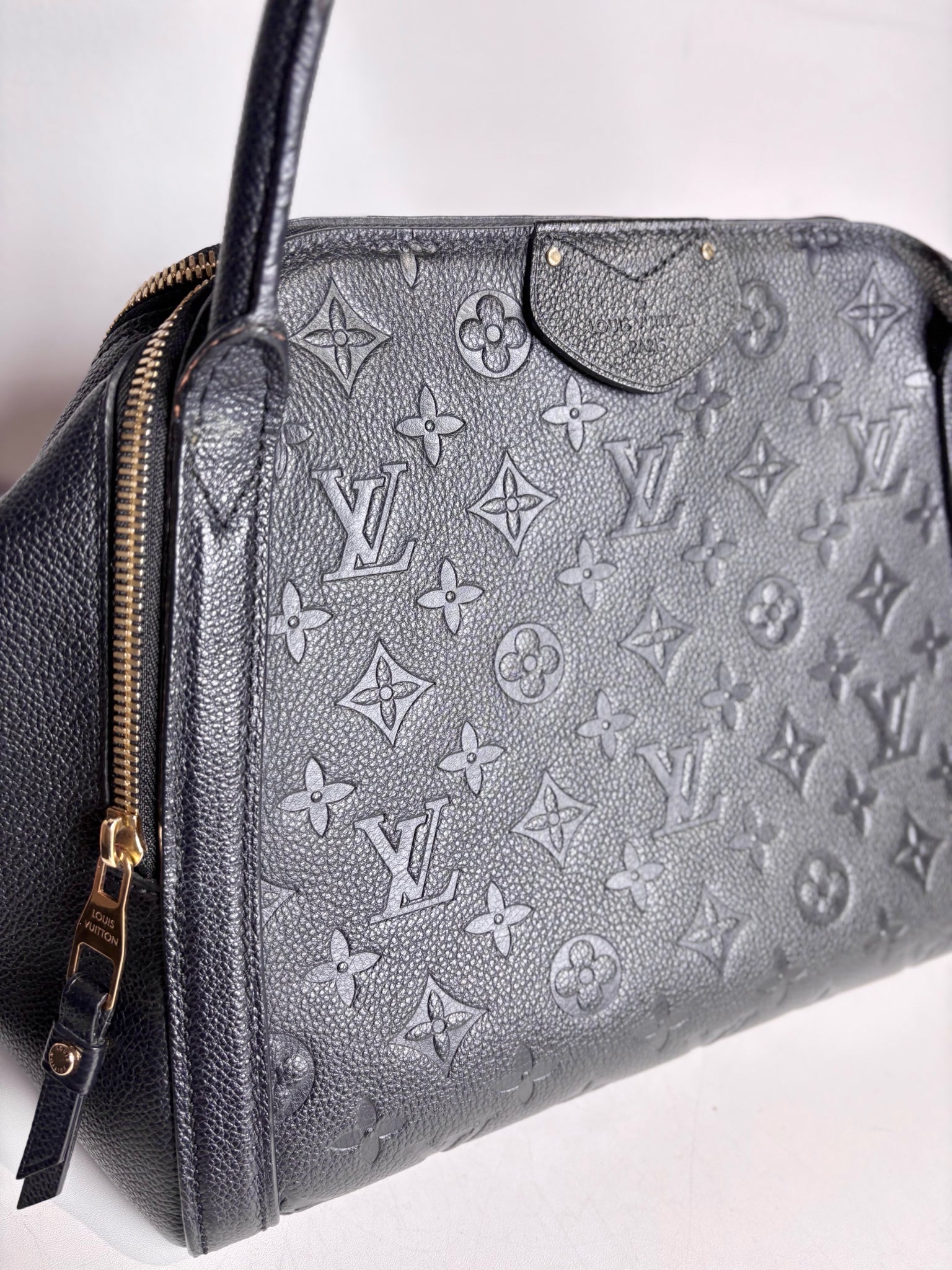 Structured and iconic, this Louis Vuitton Empreinte Marais MM purse is crafted from black Monogram leather and features a distinctive dome-shaped silhouette with rolled leather double handles, gold-tone hardware, a top zip closure, two exterior zipper compartments, and interior slip pockets, offered in a medium size and accompanied by a certificate of authenticity.
