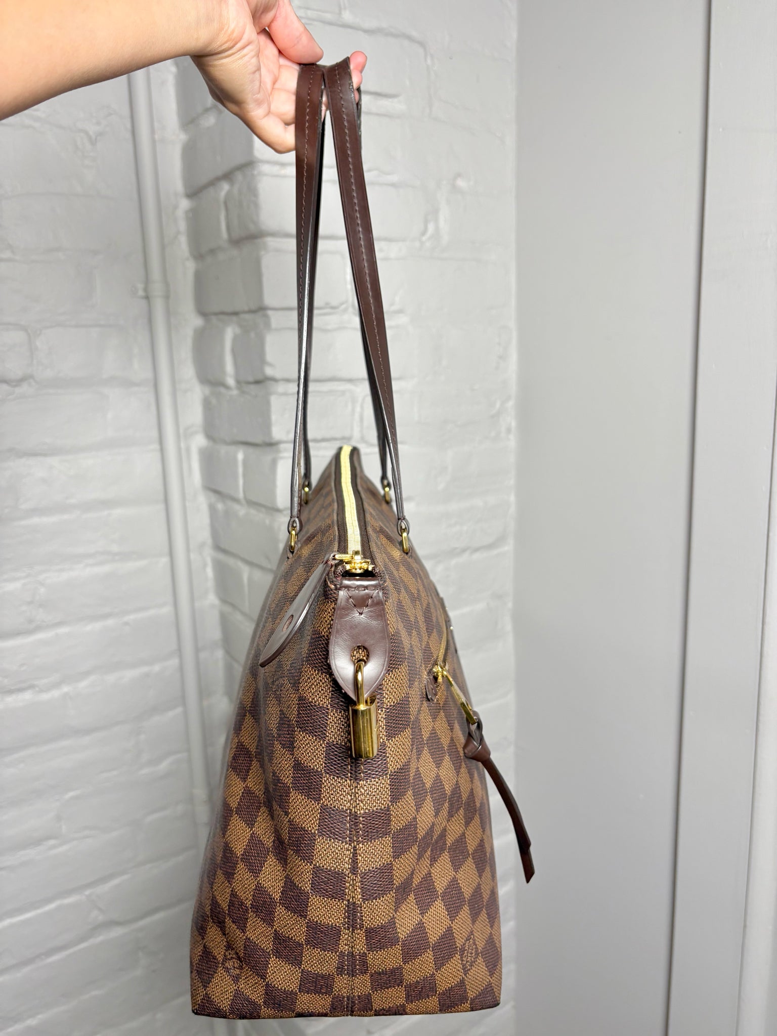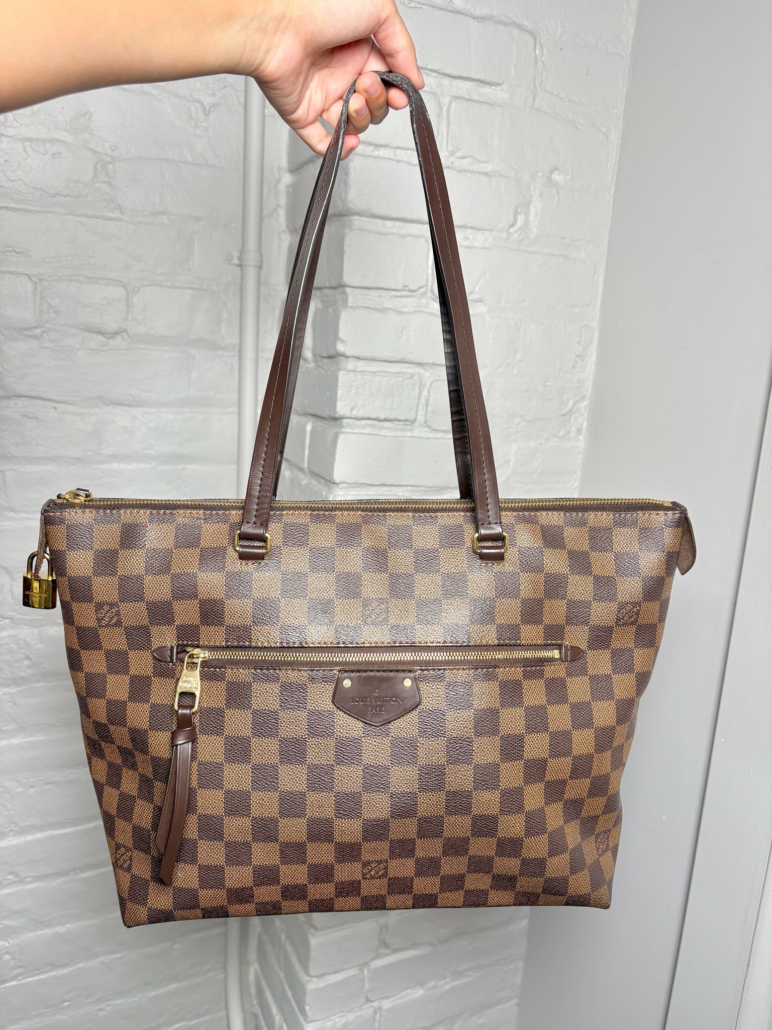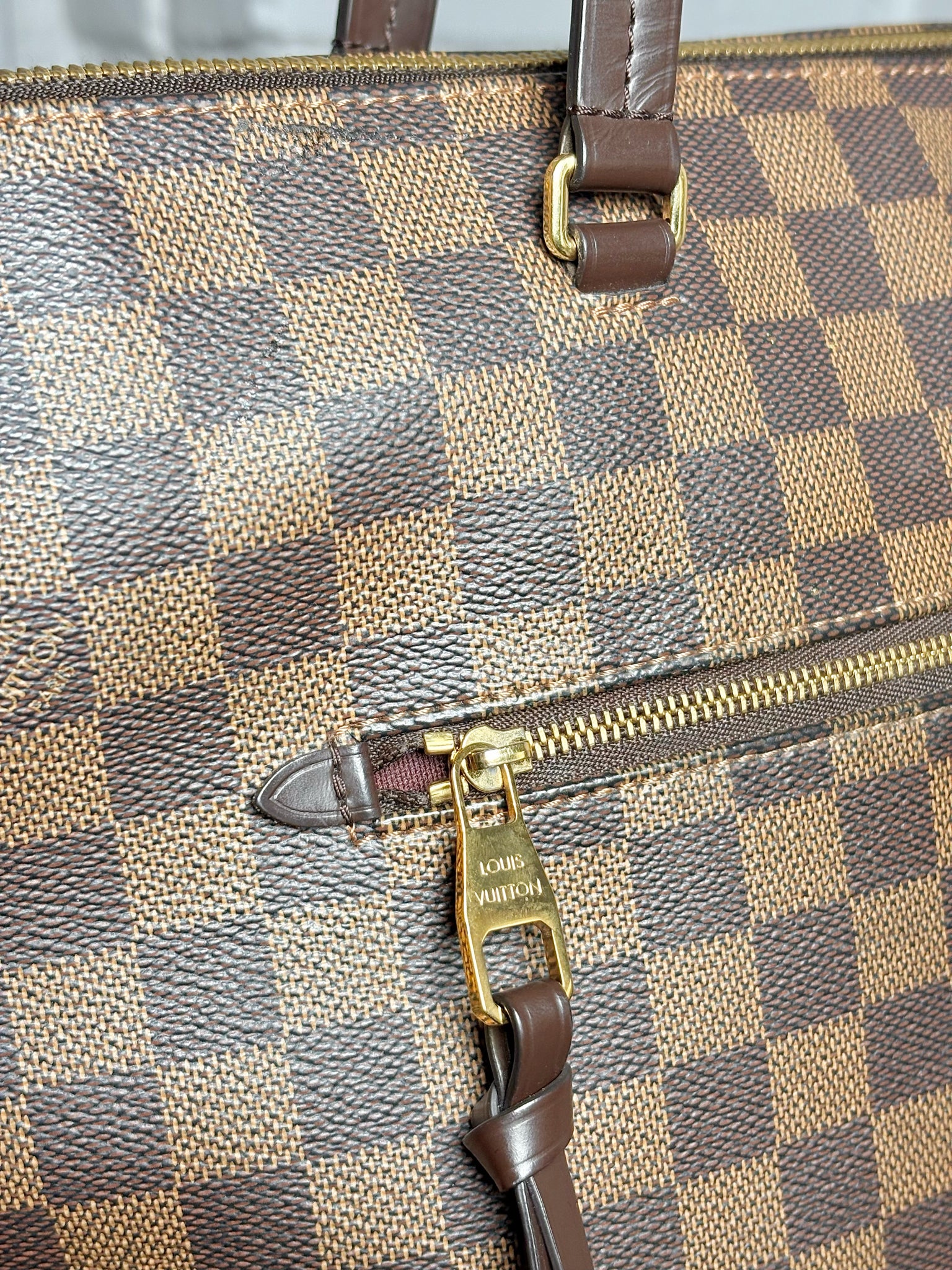 Louis Vuitton MM Iéna Damier Ebene Tote — Crafted from the iconic Damier Ebene canvas, this versatile tote features a front zipper pocket, plum canvas lining, multiple interior pockets, and a secure top zipper closure. Offered without key and priced accordingly, it remains a timeless everyday essential with Louis Vuitton’s signature elegance. The straps has some wear and a slight sticky residue (see pictures for more details).