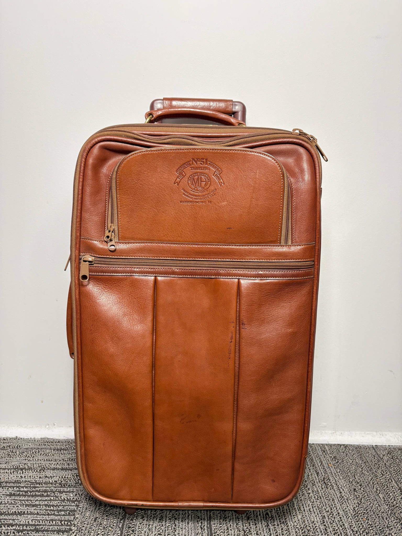 Marley Hodgson No. 51 suitcase, men's Chestnut cowhide Leather 38, fully lined w/signature checker print, in-line rolling wheels, gliding pull travel handle