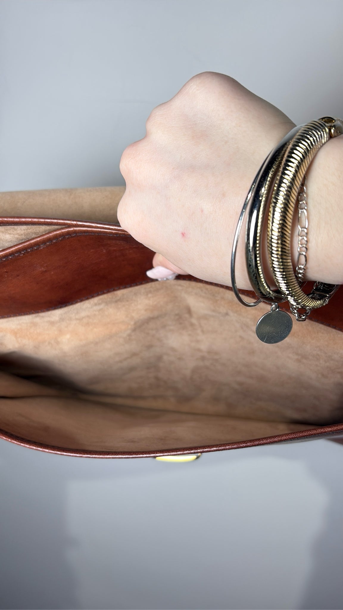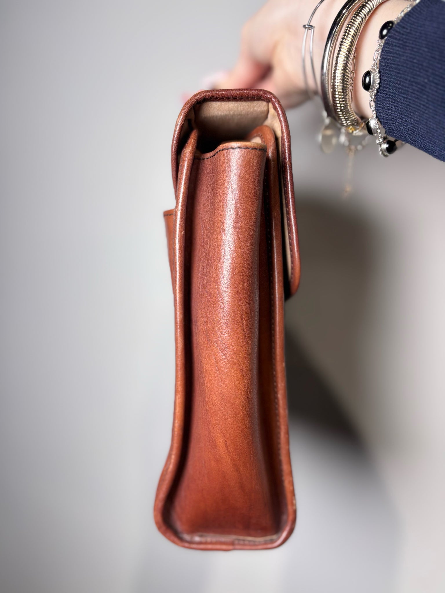 Timeless and practical, this Oroton men’s small briefcase is crafted from cognac leather and features structured attaché-style compartments, including a laptop-friendly interior for organized daily use. Presented in vintage, as-is condition, it shows some discoloration around the rivets where the detachable handle is secured (pictured).