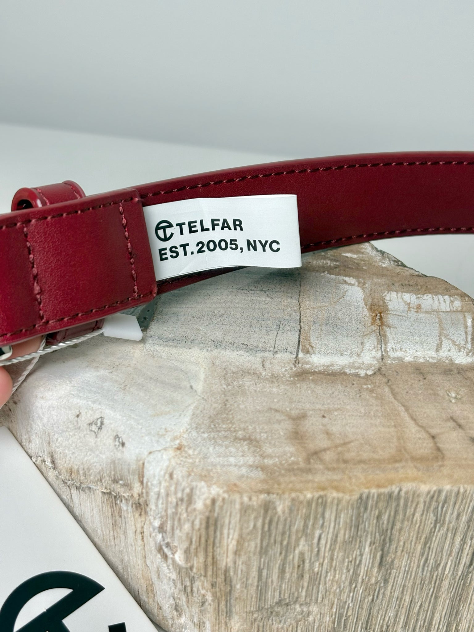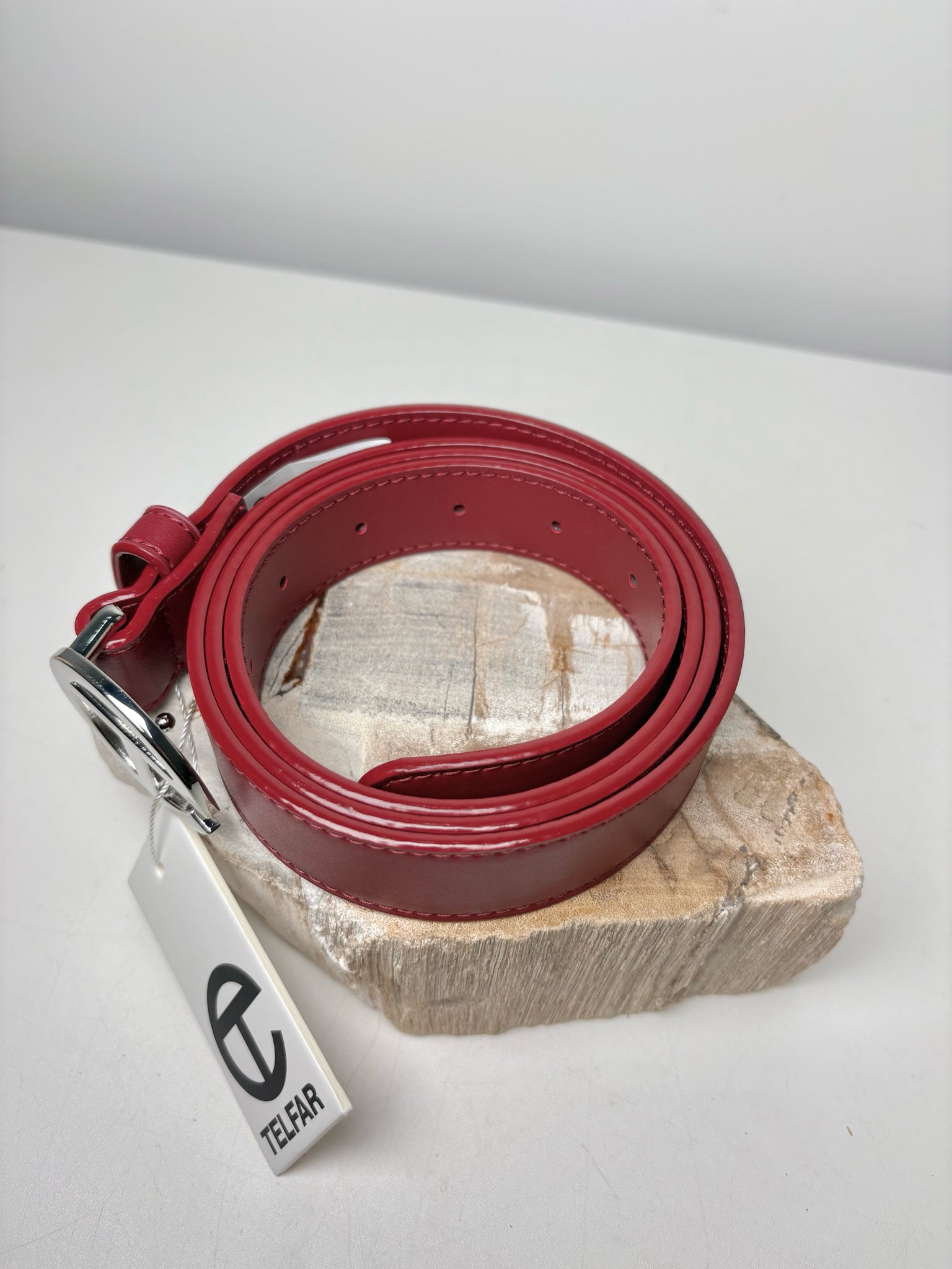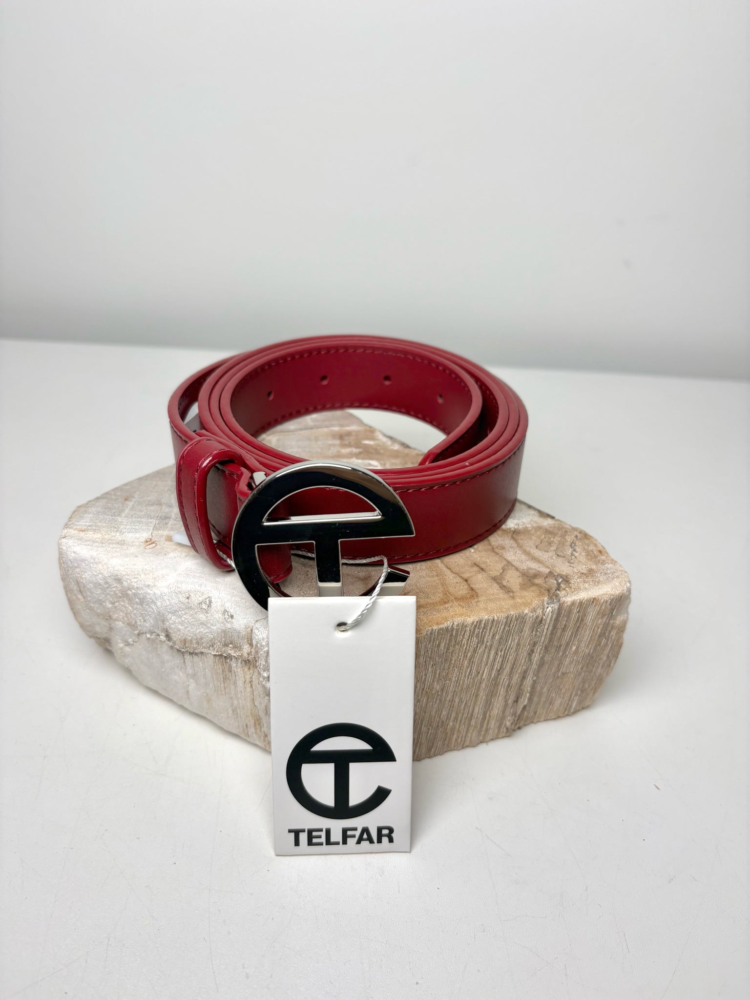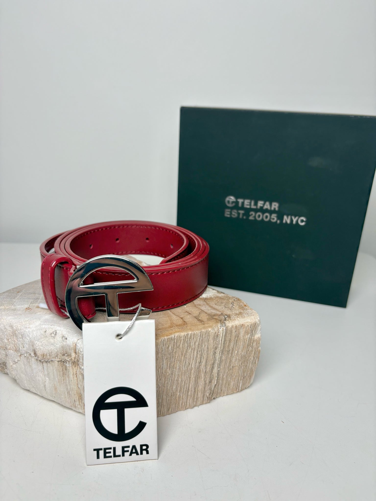 Telfar UNISEX red faux leather belt with a chrome finish logo buckle. Can fit anywhere from a 30"-46." Comes with the original box and dust bag.