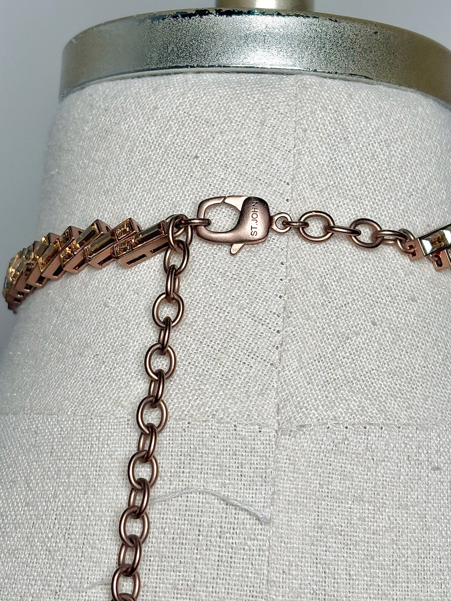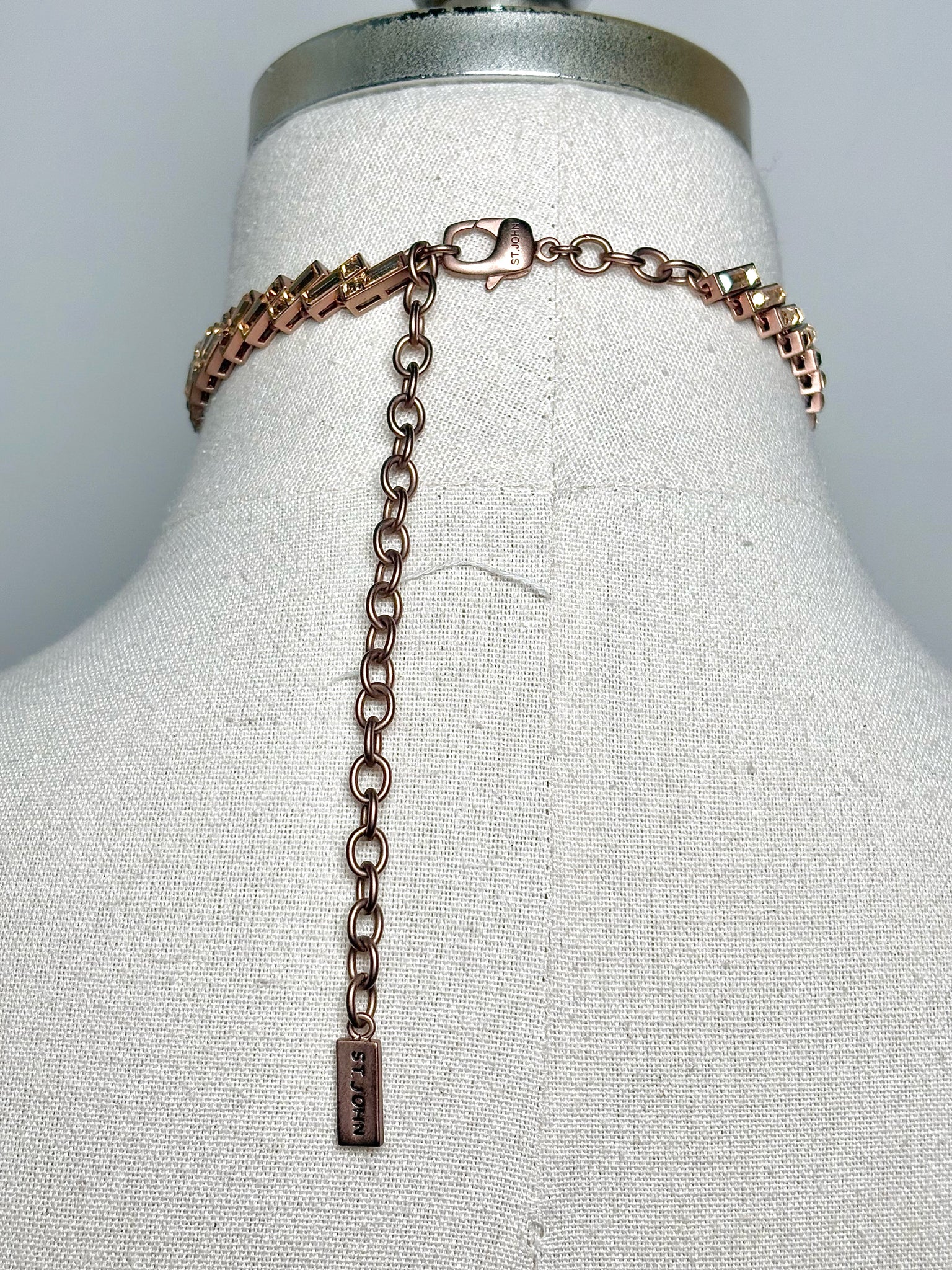 St. John bronze color crystal rhinestones necklace with lobster clasp stamped logo and logo tag on extender. It is adjustable to make into a choker or into a longer necklace.