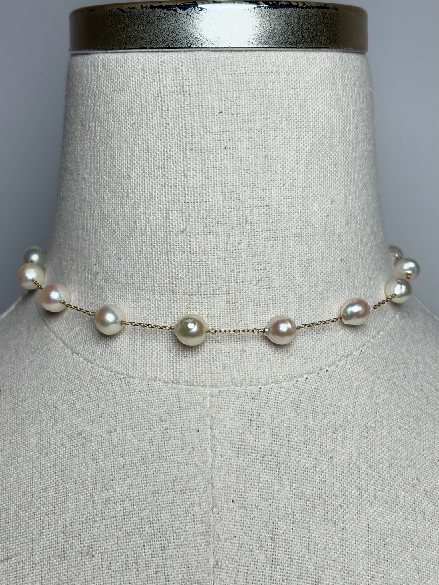 Delicate and romantic, this multi-color pearl station necklace is crafted in 14K gold and finished with a heart-shaped lobster clasp for a charming, feminine touch. Designed with evenly spaced pearls along a 14-inch chain that sits at approximately 7 inches when worn around the neck, it offers an elegant, close-to-the-collar silhouette. Presented with the original box, this refined piece blends classic craftsmanship with playful color—an effortlessly graceful addition to any fine jewelry collection.