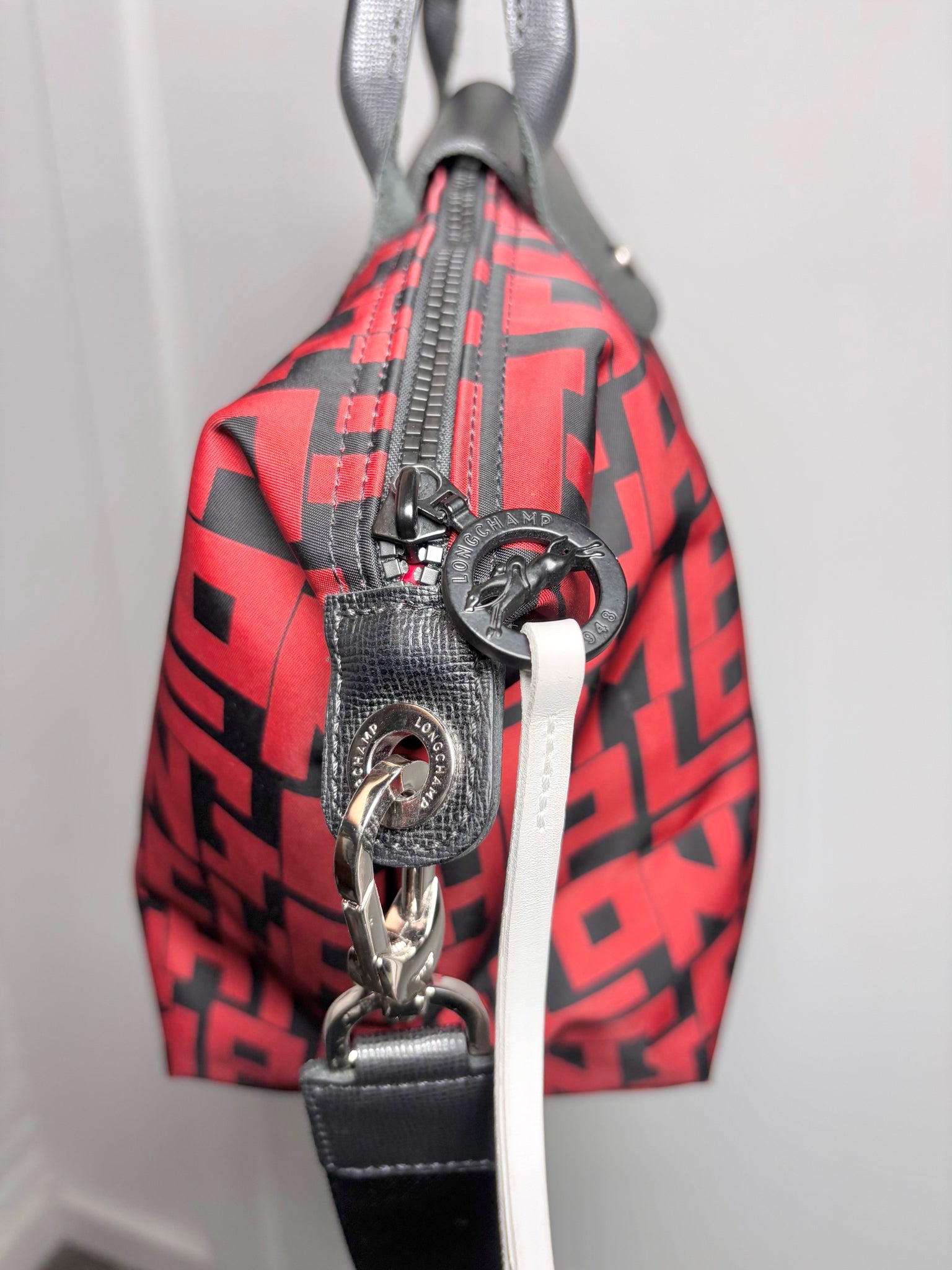 Longchamp’s Le Pliage LGP medium purse makes a striking statement with its vibrant red-and-black all-over monogram print, framed by crisp white trim and sleek silvertone hardware. Designed for modern versatility, it features dual top handles, an adjustable removable strap, and a secure top zip with snap-flap closure. Finished with leather trim and two interior slip pockets, this eye-catching piece delivers the perfect blend of graphic style, practicality, and signature Longchamp craftsmanship.
